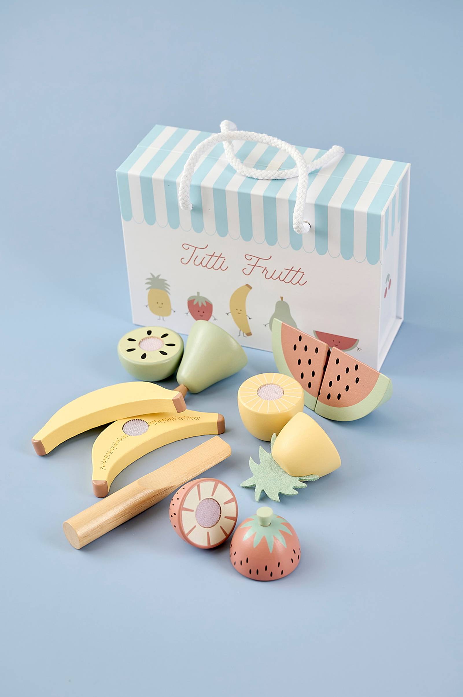 Kuka haluaa hedelmäsalaattia? Valmista herkullinen jälkiruoka näillä jabadabadon ihanilla puisilla hedelmillä. Hedelmät pidetään yhdessä tarranauhalla, ja ne voidaan jakaa mukana tulevalla veitsellä. Mikset harjoittelisi laskemista pelin aikana; kuinka monta hedelmäpalaa on, jos jaat ne ja kuinka monta, jos laitat ne taas yhteen? Hedelmien avulla voit harjoitella sekä värejä että muotoja samaan aikaan, kun motorisia taitoja harjoitellaan. Setti on valmistettu puusta, jossa on tekstiilistä valmistettuja yksityiskohtia, ja se toimitetaan suloisessa pussissa, joka on helppo avata ja sulkea magneettisoljella. Yhdistä muiden jabadabadon puisten leluruokien kanssa, jotta leikkimisestä tulee entistä hauskempaa. Sisältää: pussi magneettilukolla,1 x pussi magneettilukolla.