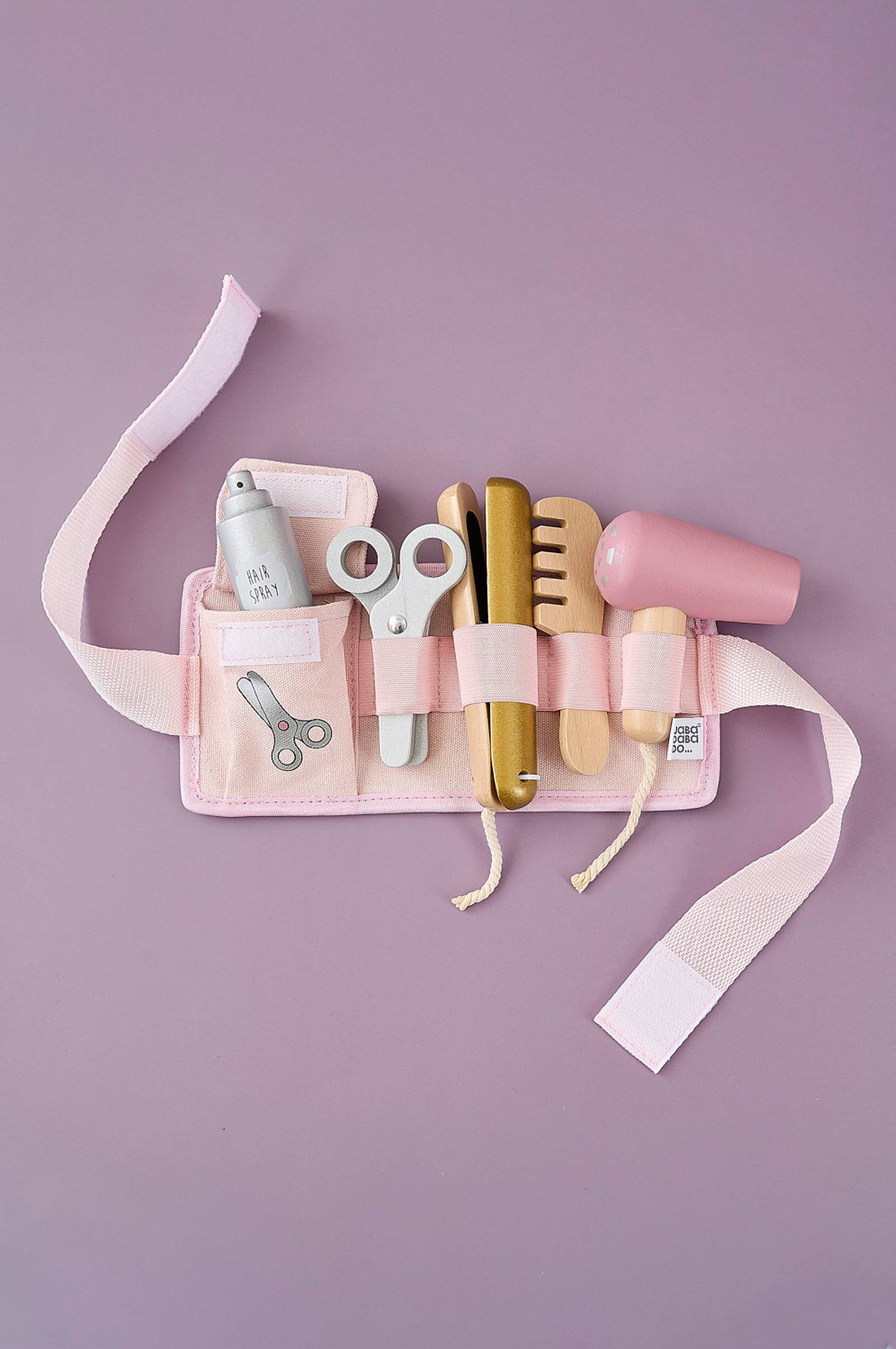 Nyt voit vihdoin avata oman pienen kampaamosi kotona! Söpössä kampaamosetissämme on kaikki, mitä tarvitset erilaisten hauskojen kampausten leikkaamiseen ja muotoiluun. Leikkaa, föönaa ja litistä, mielikuvituksesi on ainoa raja sille, millaisia hulluja tai kauniita kampauksia haluat. Laita hiuksesi ylös söpöillä klipsuilla tai hiuslenkillä. Kampaussetin avulla sinusta tulee nopeasti hiusten leikkaamisen ammattilainen. Vyössä on tarranauha, joka on helppo kiinnittää lonkan ympärille, ja sitten olet valmis aloittamaan leikkaamisen! Vyö puhdistetaan sienipintapesulla. Hyväksytty 18 kuukaudesta alkaen. Kampauspakkaus sisältää: 1x säädettävä vyö tarrakiinnityksellä 1x hiustenkuivaaja 1x kampa 1x suoristusrauta 1x sakset 1x pullo hiuslakkaa.