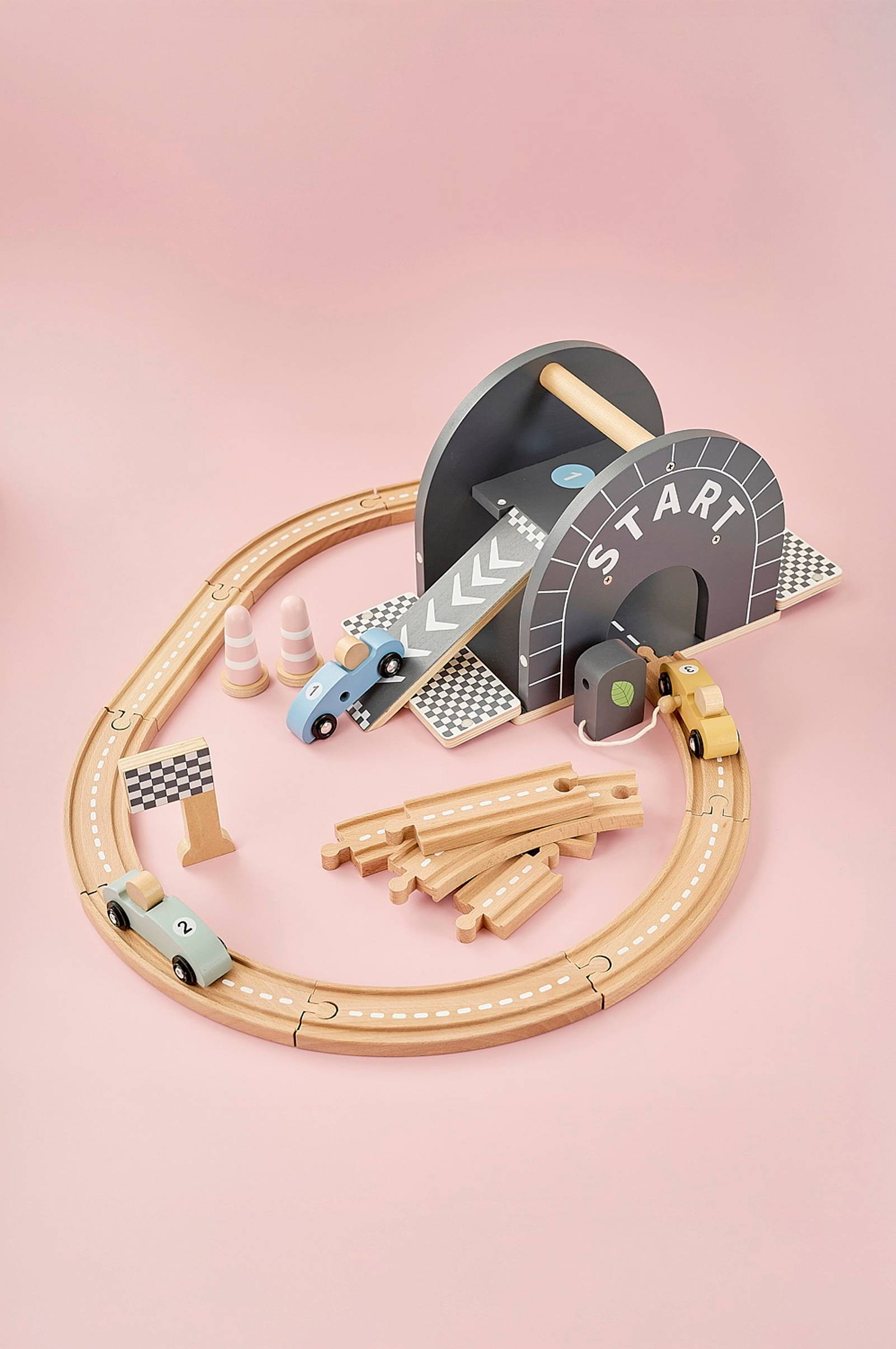 Käynnistä moottorit ja valmistaudu vauhdikkaisiin kisoihin. Tällä tyylikkäällä ja leikkisällä puisella kilparatasarjalla lapset voivat luoda omia kilpa-ajoseikkailujaan - alusta loppuun. Rata on suunniteltu soikeaksi radaksi, jossa on pehmeät mutkat, tiemerkinnät ja monitasoinen ramppi, jota pitkin autot voivat huristella täydellä vauhdilla. Neljä värikästä kilpa-autoa on valmiina lähtöviivalla, ja liikennekartioiden ja ruutulipun ansiosta kisatunnelma on heti valmis. Kaikki on valmistettu puusta, ja sen ajaton muotoilu ja pehmeät, hillityt värit sopivat kauniisti mihin tahansa huoneeseen. Lapset pääsevät harjoittelemaan hienomotoriikkaa ja yhteistyötä samalla, kun he antavat luovuutensa viedä voiton. Täydellinen pienille vauhdin ystäville, jotka ovat kolmevuotiaita tai sitä vanhempia - olipa kyse sitten ystävällisestä kisasta tai jännittävästä mestaruudesta. Kilparata on hauska, kestävä ja visuaalisesti houkutteleva lelu, joka kannustaa liikkumiseen, mielikuvitusleikkeihin ja luovuuteen joka ikinen päivä.