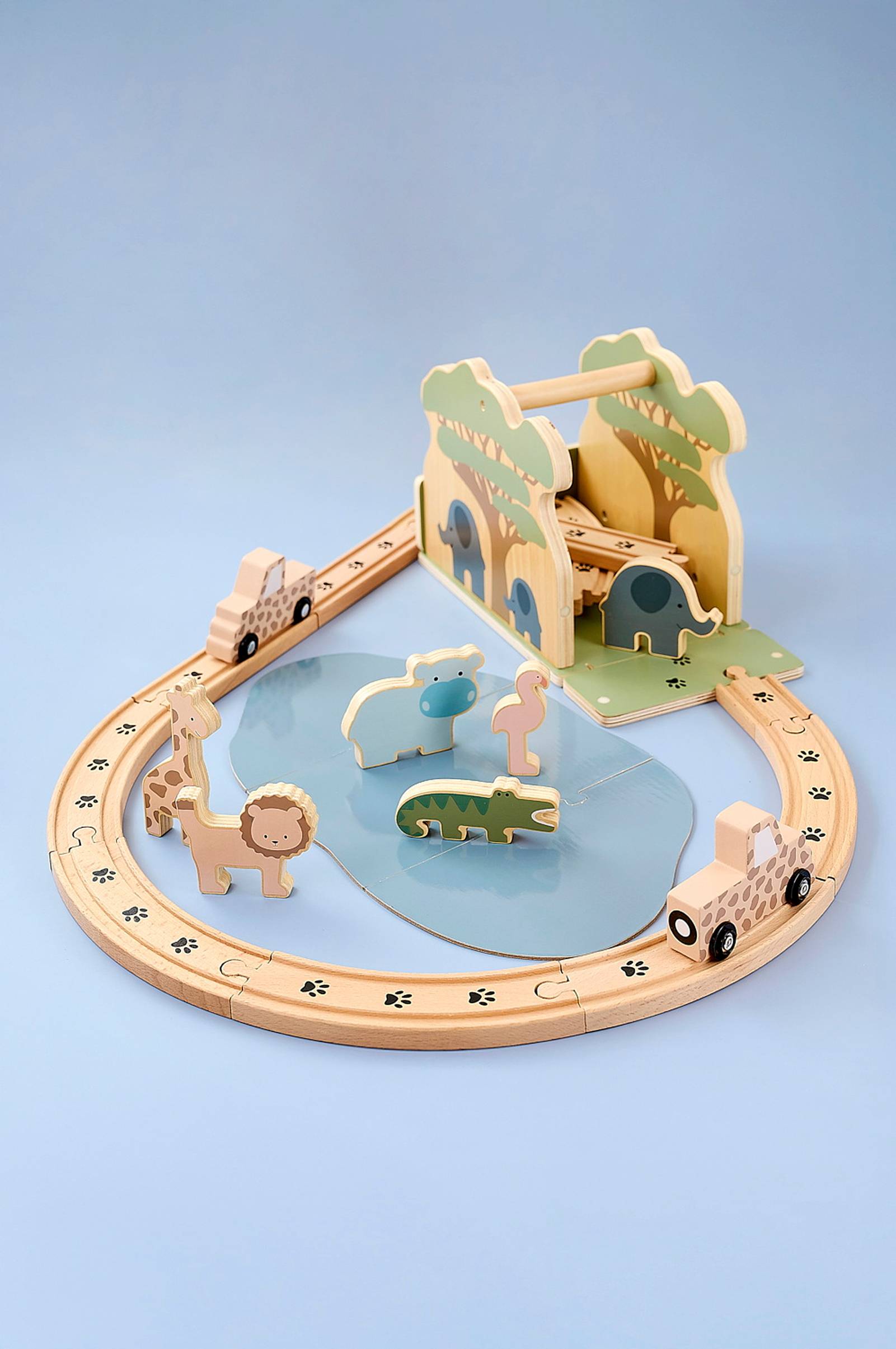 Lähde mielikuvitusmatkalle savannin sydämeen. Tämä viehättävä puinen junasarja houkuttelee tuntikausia luovaan leikkiin, kun lapset tutkivat leijonien, kirahvien, norsujen ja muiden villieläinten täyttämää maailmaa. Puiset raiteet mutkittelevat suuren, kauniin puun ympärillä ja kulkevat juottopaikan ohi, jonne eläimet kokoontuvat juomaan ja lepäämään. Kaikki on valmistettu kestävästä puusta ja maalattu rauhallisilla, harmonisilla väreillä, jotka vetoavat sekä lapsiin että aikuisiin. Hahmot on suunniteltu pienille käsille, ja ne kannustavat tarinankertomiseen, roolileikkeihin ja mielikuvitukseen. Pieni juna yhdessä eläinten ja luonnon inspiroimien maisemien kanssa luo inspiroivan ympäristön, jossa jokaisesta leikkihetkestä tulee uusi seikkailu. Puinen junasafari sopii kolmivuotiaille ja sitä vanhemmille lapsille - hauska, turvallinen ja opettavainen lelu, joka on myös kaunis lisä minkä tahansa lapsen huoneeseen.