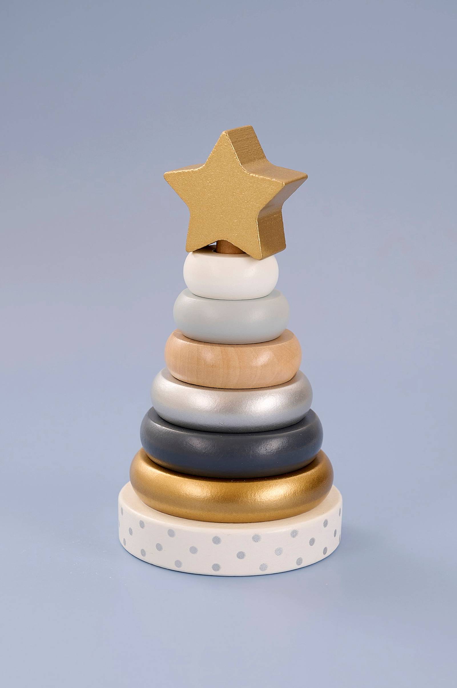 Pinoamistorni on klassinen must-have-lelu kaikille pienimmille. Pinoamistornissamme on eri värejä hopean ja kullan sävyissä, ja sitä koristaa puinen tähti huipulla. Tämä lelu edistää lapsen käsitystä muodon, värien ja koon erottelusta. Se kehittää myös lapsen käden ja silmän koordinaatiota ja hienomotoriikkaa. Pinoamistanko on taivutettava, mikä takaa parhaan mahdollisen turvallisuuden.