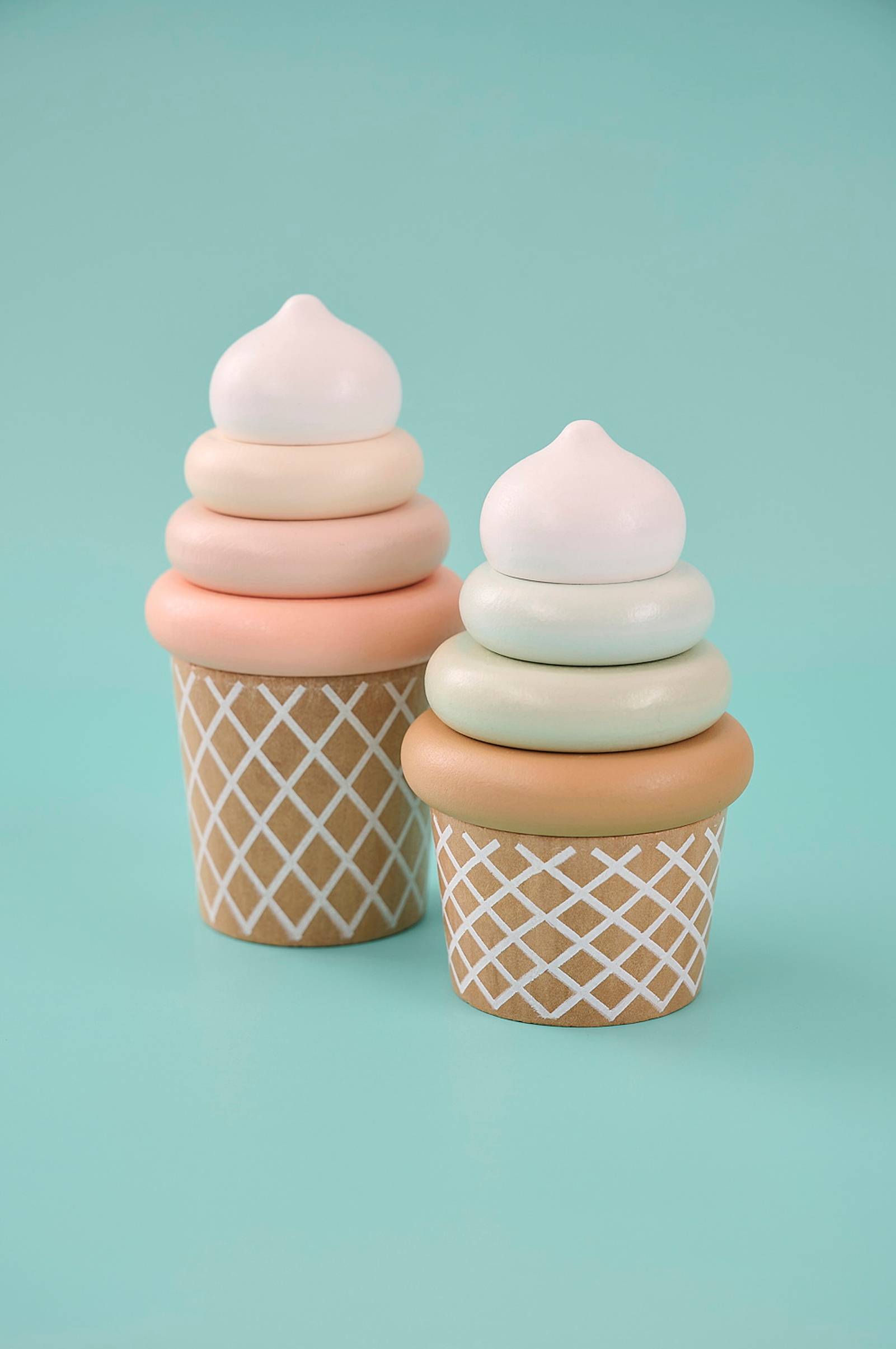 Rakenna unelmiesi jäätelö! Pinottavan lelujäätelömme avulla lapset voivat luoda omia herkullisia luomuksiaan yhä uudelleen ja uudelleen. Pehmeät pastellivärit ja kauniit puiset yksityiskohdat tekevät jäätelöstä yhtä hauskan leikkiä sillä kuin sitä on hauska katsella! Stimuloi mielikuvitusta ja kehitä motorisia taitoja, kun pinoat jäätelökauhoja ja lisäät niiden päälle loraus kermaa. Täydellinen pienille kokkeille, jotka rakastavat mielikuvitusleikkejä keittiössä. Kestävä ja ajaton lelu tuntikausien leikkimieliseen hauskanpitoon! 1x isompi pinottava jäätelötötterö, 1x pienempi pinottava jäätelötötterö.
