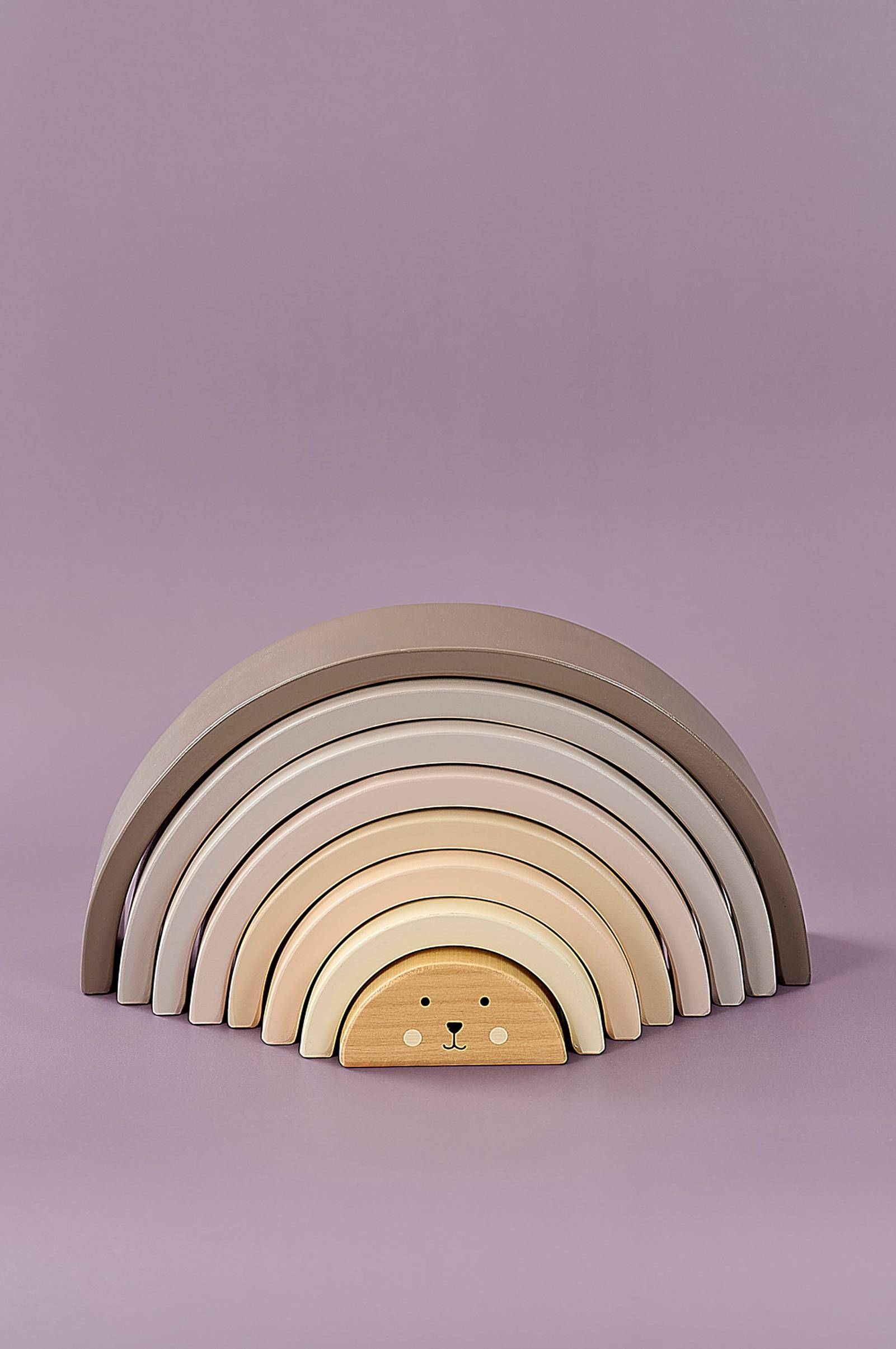 Tämä puinen sateenkaari koostuu kahdeksasta eri osasta. Jokaisella osalla voidaan leikkiä erikseen tai yhdessä pinoamisleluna. Mikset rakentaisi jännittäviä tunneleita, pieniä taloja nukeille tai siltoja lempiautolle. Vain lapsen mielikuvitus asettaa rajat. Kannustaa luovaan leikkiin. Mitat (cm): 5x1x26.