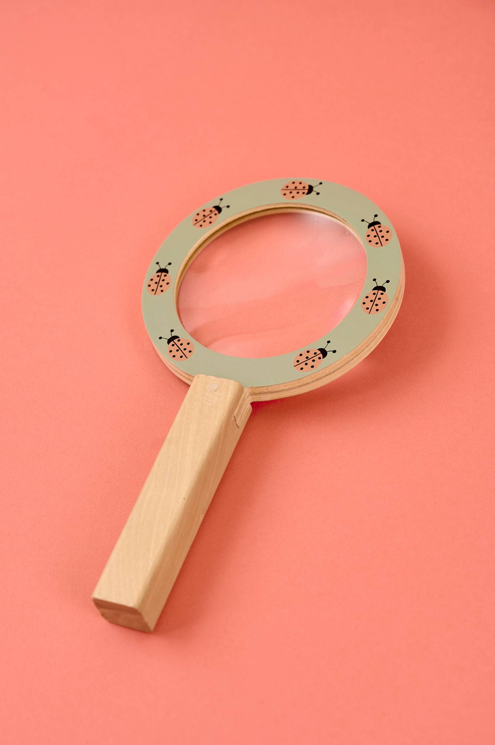 "Näetkö pienet pisteet sen selässä?" Anna lapsesi löytää pienten asioiden kauneus jabadabadon suurennuslasin avulla. Kahva on valmistettu luonnonpuusta, ja hillityn vihreää kehystä koristavat suloiset leppäkertut. Täydellinen uteliaille pienille tutkimusmatkailijoille, jotka haluavat tutustua maailmaan läheltä.