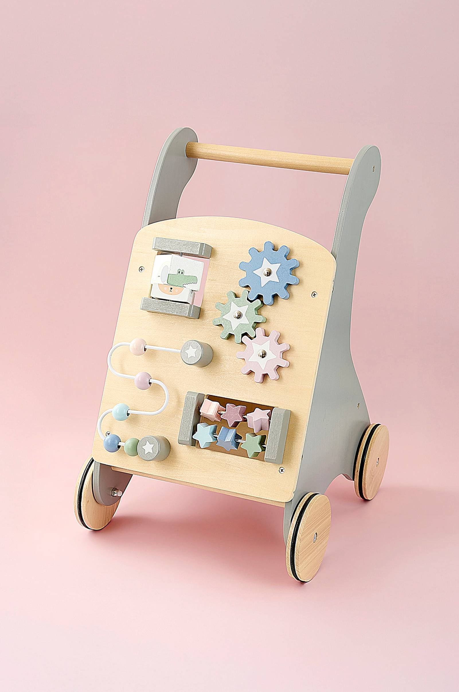 Söpöt aktiviteettivaunumme ovat hauska lelu, joka auttaa lasta pääsemään omilleen. Sillä on myös hauska leikkiä, sillä sen etupuolella on paljon hauskoja aktiviteetteja. Vaunuihin on yhdistetty hauskoja aktiviteettileluja, joiden avulla lapsi voi kehittää aistejaan ja motorisia taitojaan. Aktiviteettivaunut eivät ainoastaan kannusta lasta oppimaan kävelemään, vaan auttavat häntä myös kehittämään sekä tasapainoa että hienomotoriikkaa. Nyt lapsellesi avautuu aivan uusi maailma, jossa hän voi kävellä kuin koskaan ennen. Vaunujen pyörät on myös suunniteltu erityisesti siten, että ne eivät jätä jälkiä lattiaan. Vaunuissa on pieni pallokehikko, jonka päällä lapsi voi pyörähtää ja vetää palloja eteen- ja taaksepäin.