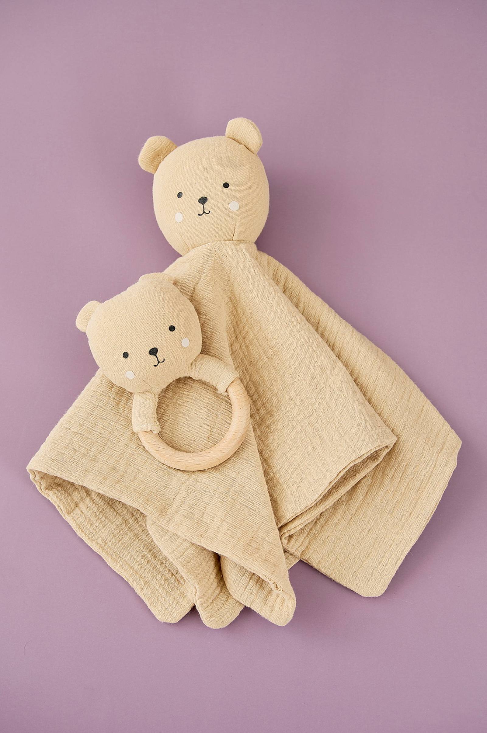 Vauvalahja, jossa on cuddle.this vauvalahja on täynnä ihastuttavia tuotteita, joista tulee perheen välttämättömiä. Baby cuddle .100 % musliinipuuvillaa oleva cuddle on suunniteltu mukaviin päiväuniin ja nukkumaanmenoaikaan ja se on täydellinen kumppani lämpimiin ja hellävaraisiin hetkiin. Baby wood rattle.söpö tekstiilinen helistin, jossa on puinen kahva, stimuloi vauvan aisteja ja on täydellinen lelu vauvan kehityspolulla.