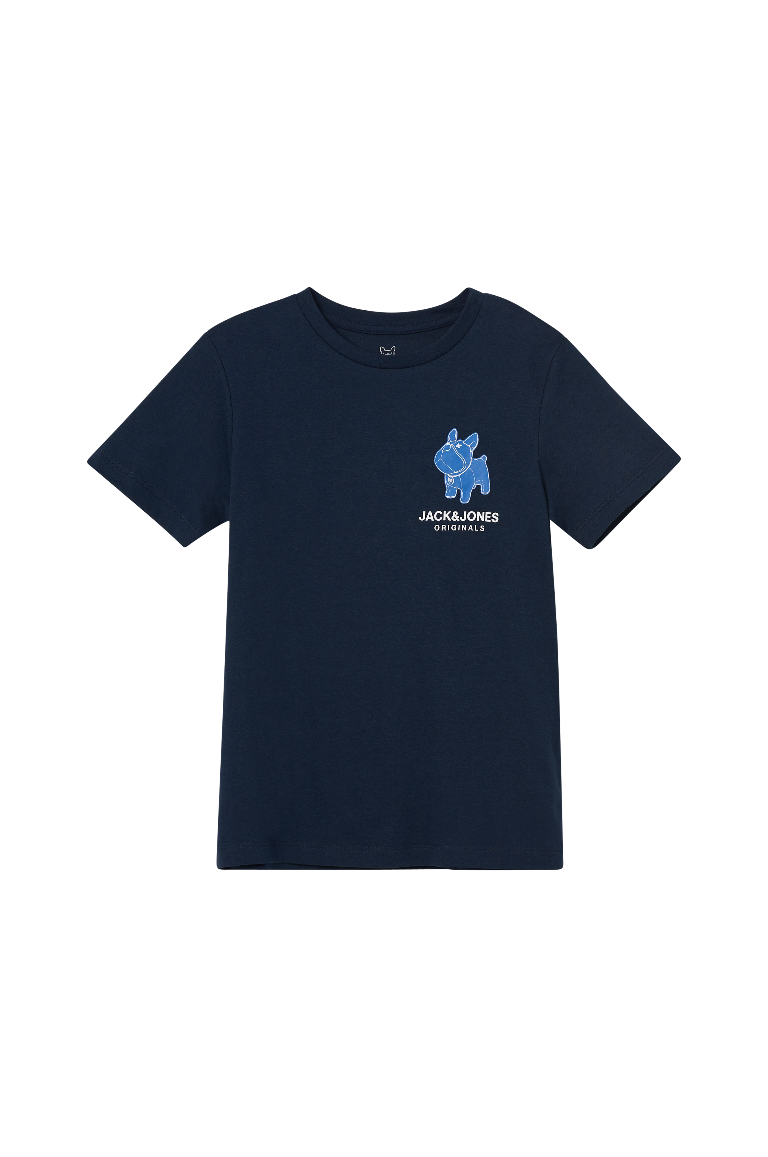 T-paita, jossa pyöreä pääntie ja painatus edessä.