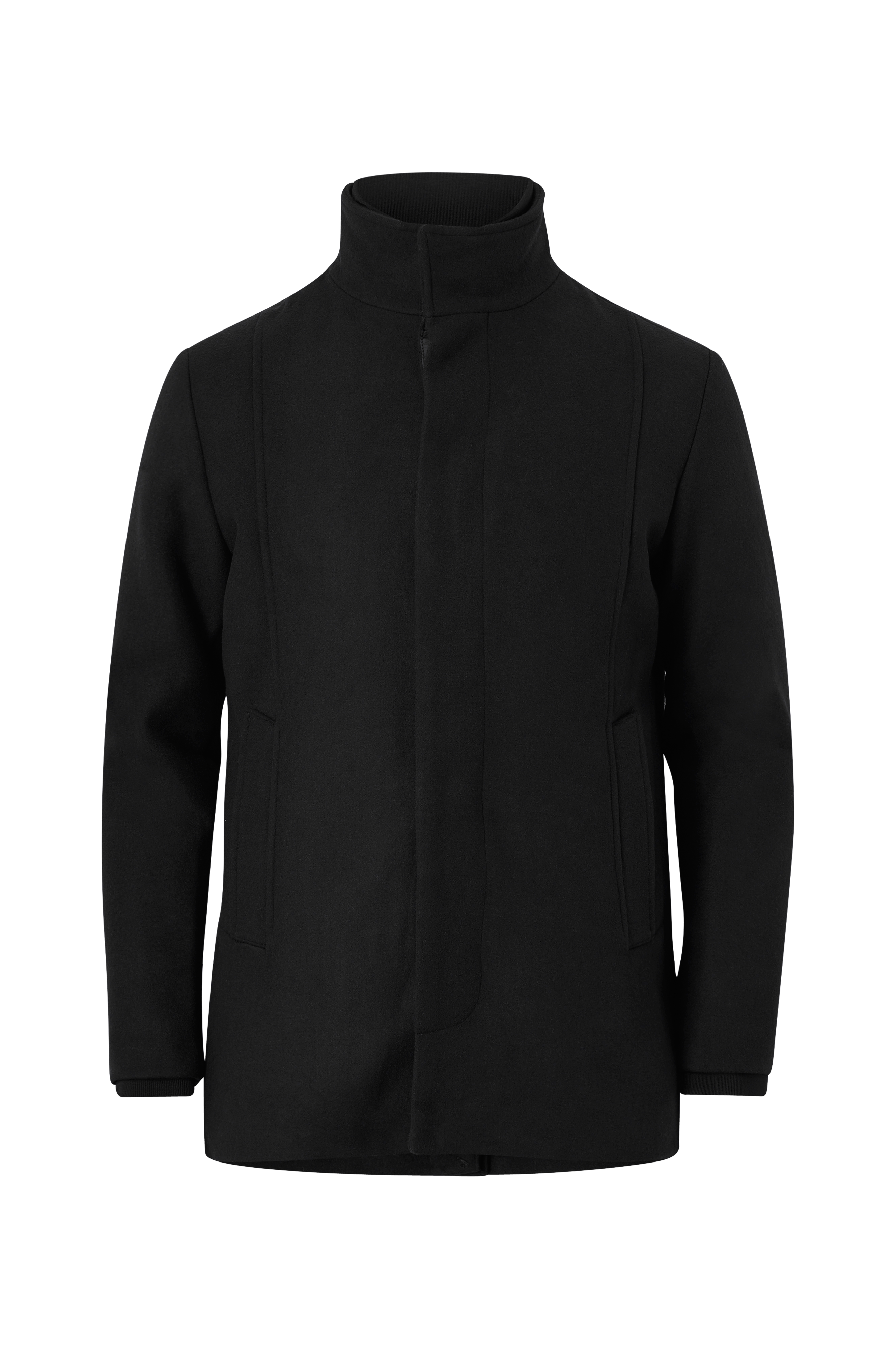 Takki huovutettua villasekoitetta, jossa vettä hylkivä pinta. Tikattu ja kevyesti topattu vuori. Korkea kaulus ja piilonapitus. Kaksi taskua ja resori hihansuissa. Halkio helmassa takana. Pituus n. 80 cm koossa M.