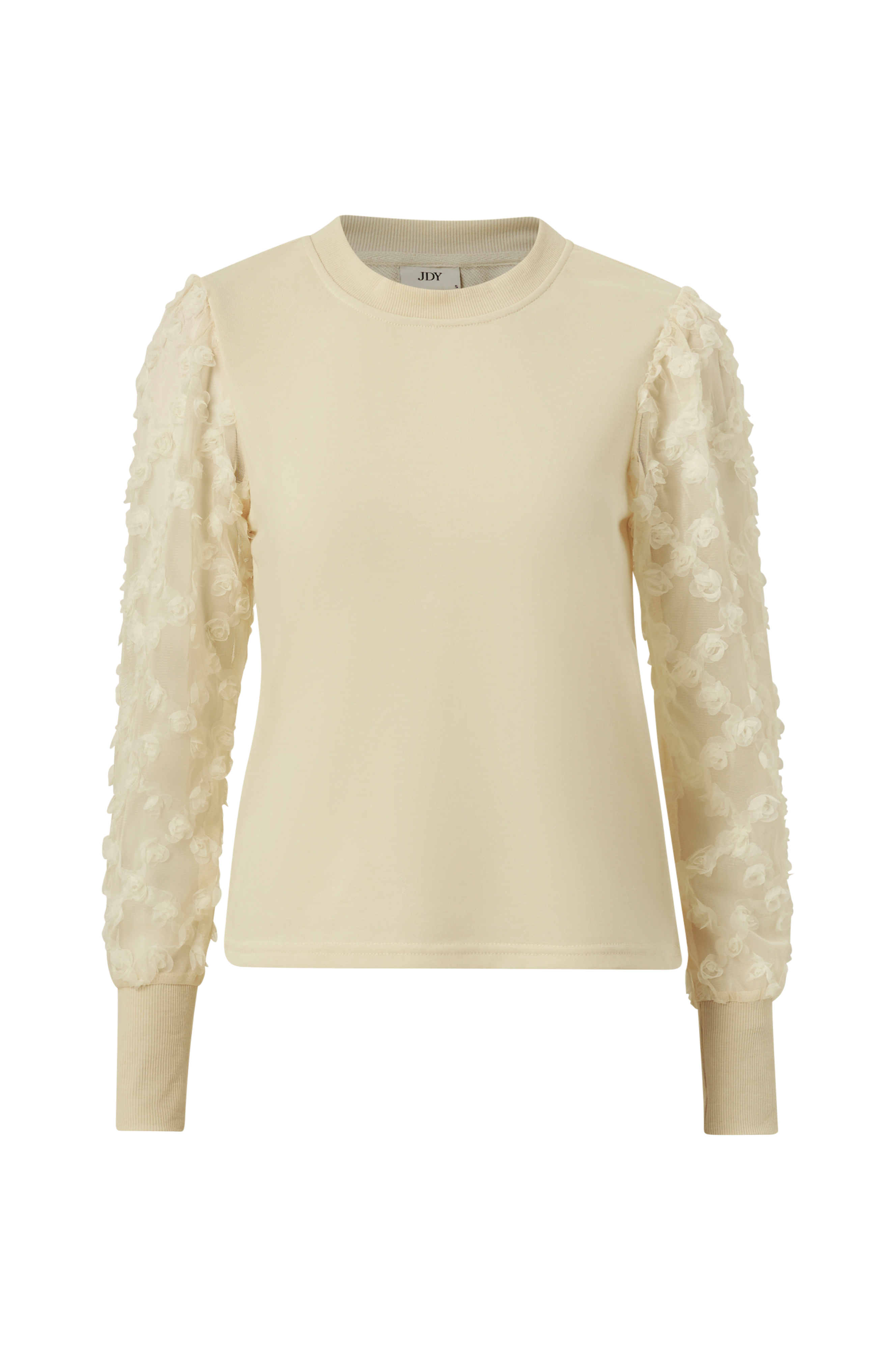 Collegepusero pehmeää, joustavaa trikoota. Pyöreä joustinneulospääntie ja pitkät hihat läpikuultavaa verkkokangasta, jossa päälleommellut röyhelöyksityiskohdat. Hihansuissa resori.