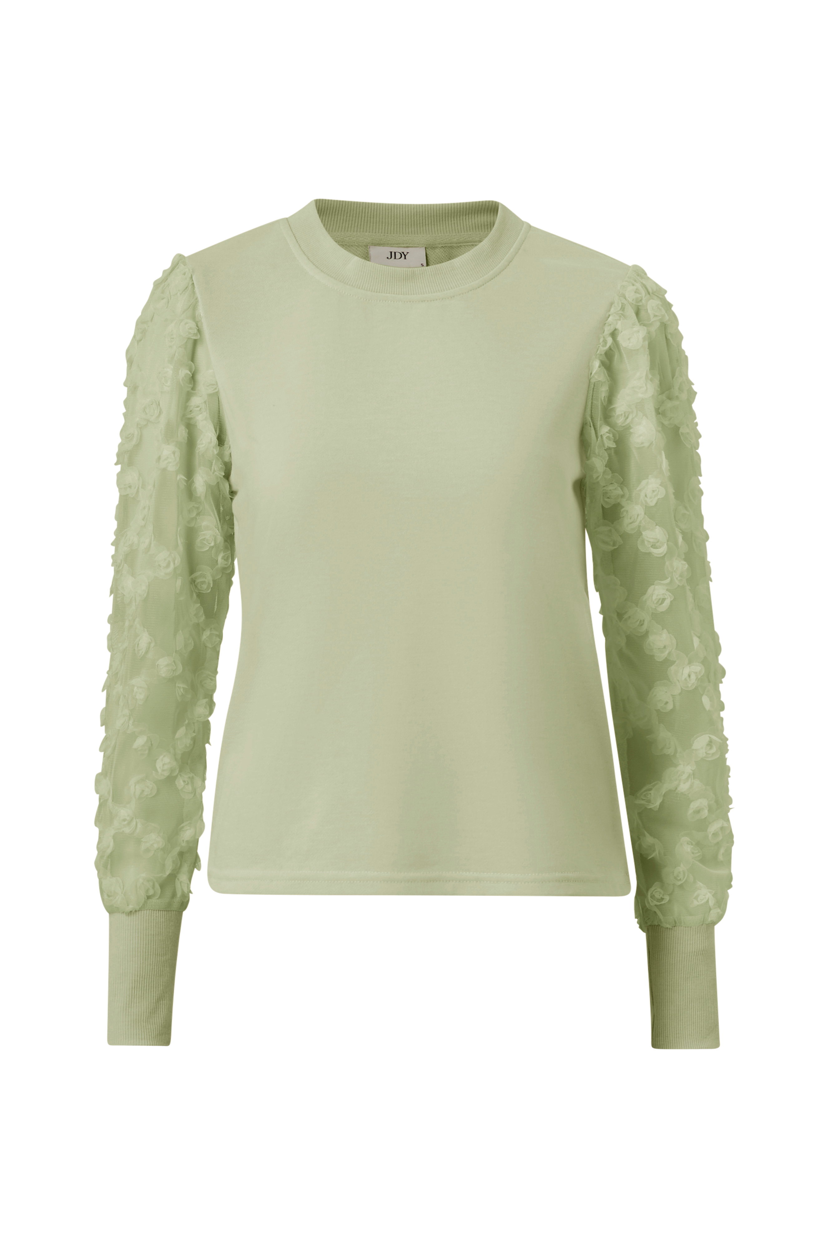Collegepusero pehmeää, joustavaa trikoota. Pyöreä joustinneulospääntie ja pitkät hihat läpikuultavaa verkkokangasta, jossa päälleommellut röyhelöyksityiskohdat. Hihansuissa resori.