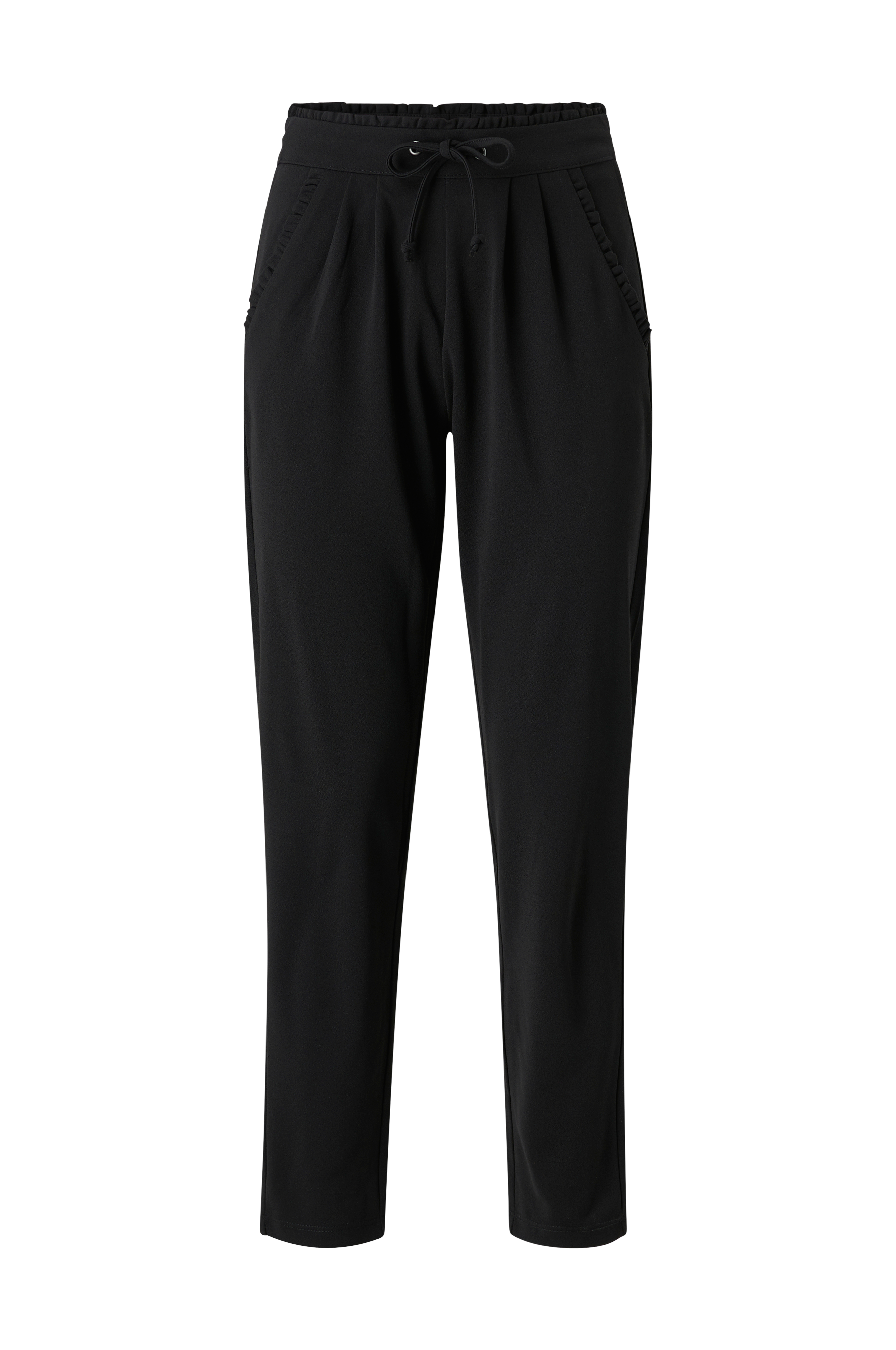 Jacqueline de Yong jdyCatia New Pant Jrs -housut stretchmateriaalia. Kapeneva istuvuus. Joustava vyötärö, jossa nyöri ja röyhelö ylhäällä. Taskut, joissa röyhelöreuna edessä. Lahkeen sisäpituus n. 76 cm koossa S.