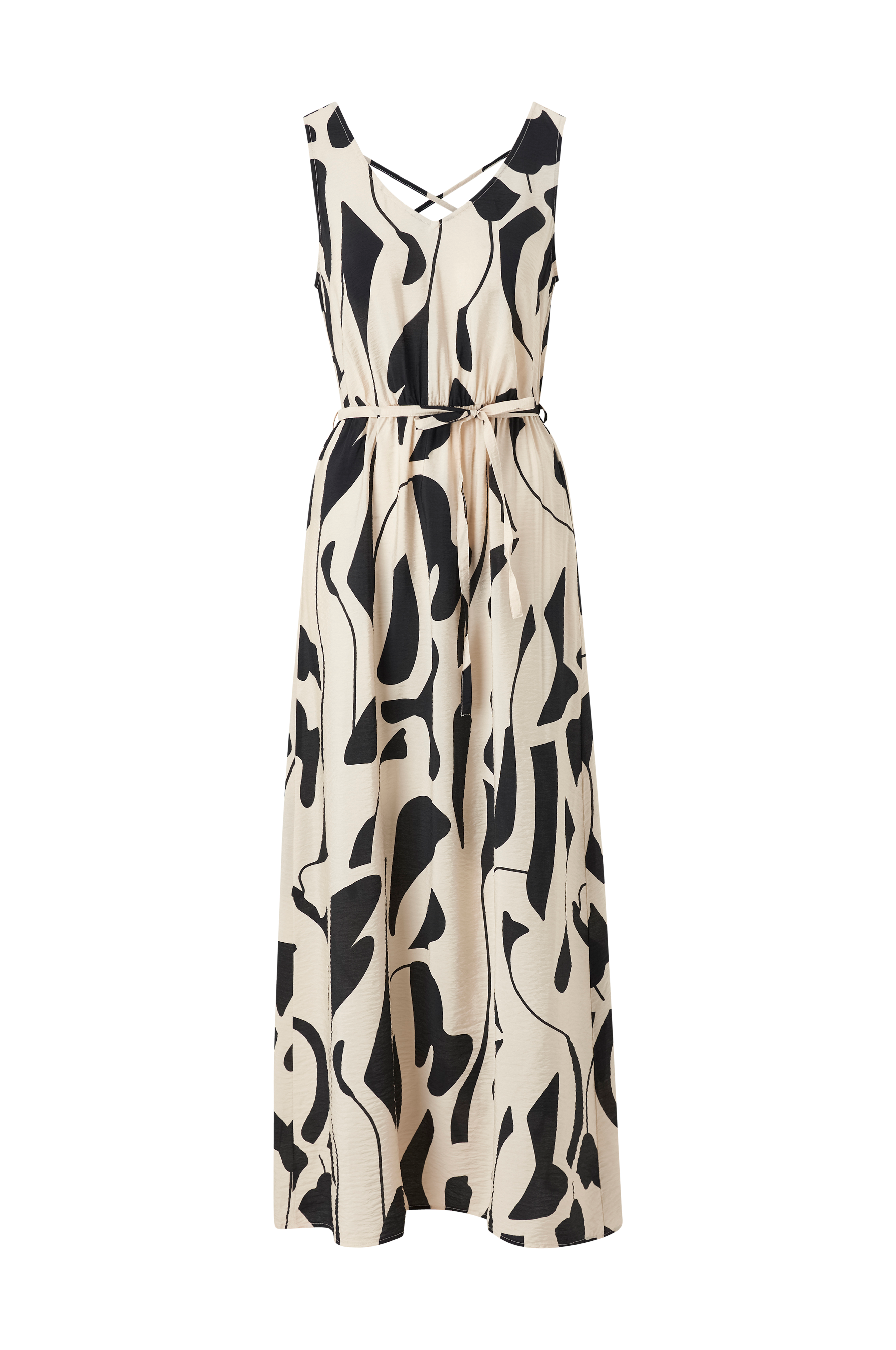 • Pitkä, kuvioitu mekko• V-pääntie edessä ja takaosa• Koristeelliset, ristikkäiset nauhat selässä• Joustava vyötärö nyörillä• Pituus: 141 cm koossa S