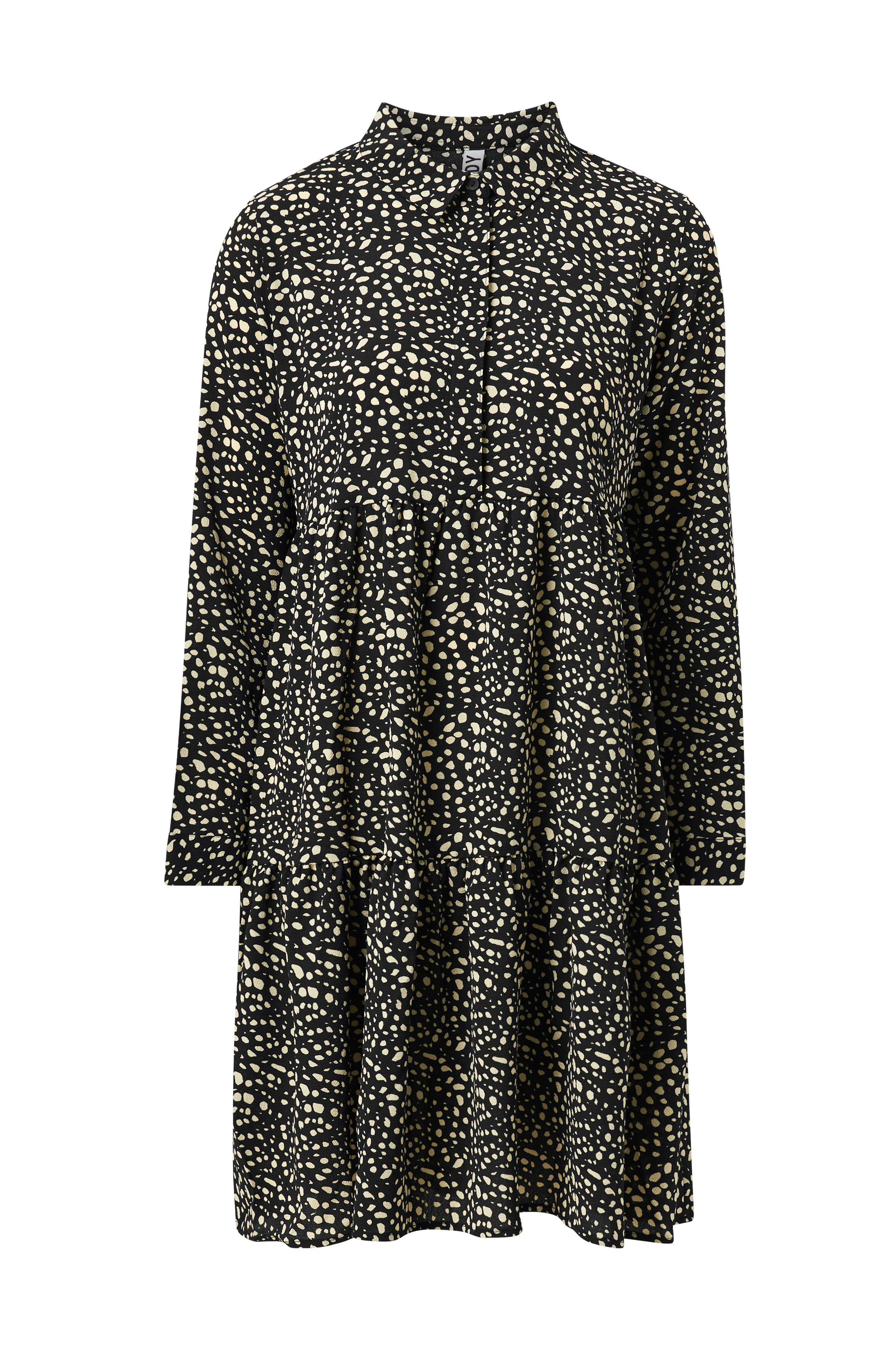 Kuviollinen mekko kreppimateriaalia. Puolipitkä piilonappilista ylhäällä edessä, levenevä röyhelöhame ja pitkät hihat, joissa kalvosin ja nappi hihansuissa. Pituus n. 97 cm koossa 36.