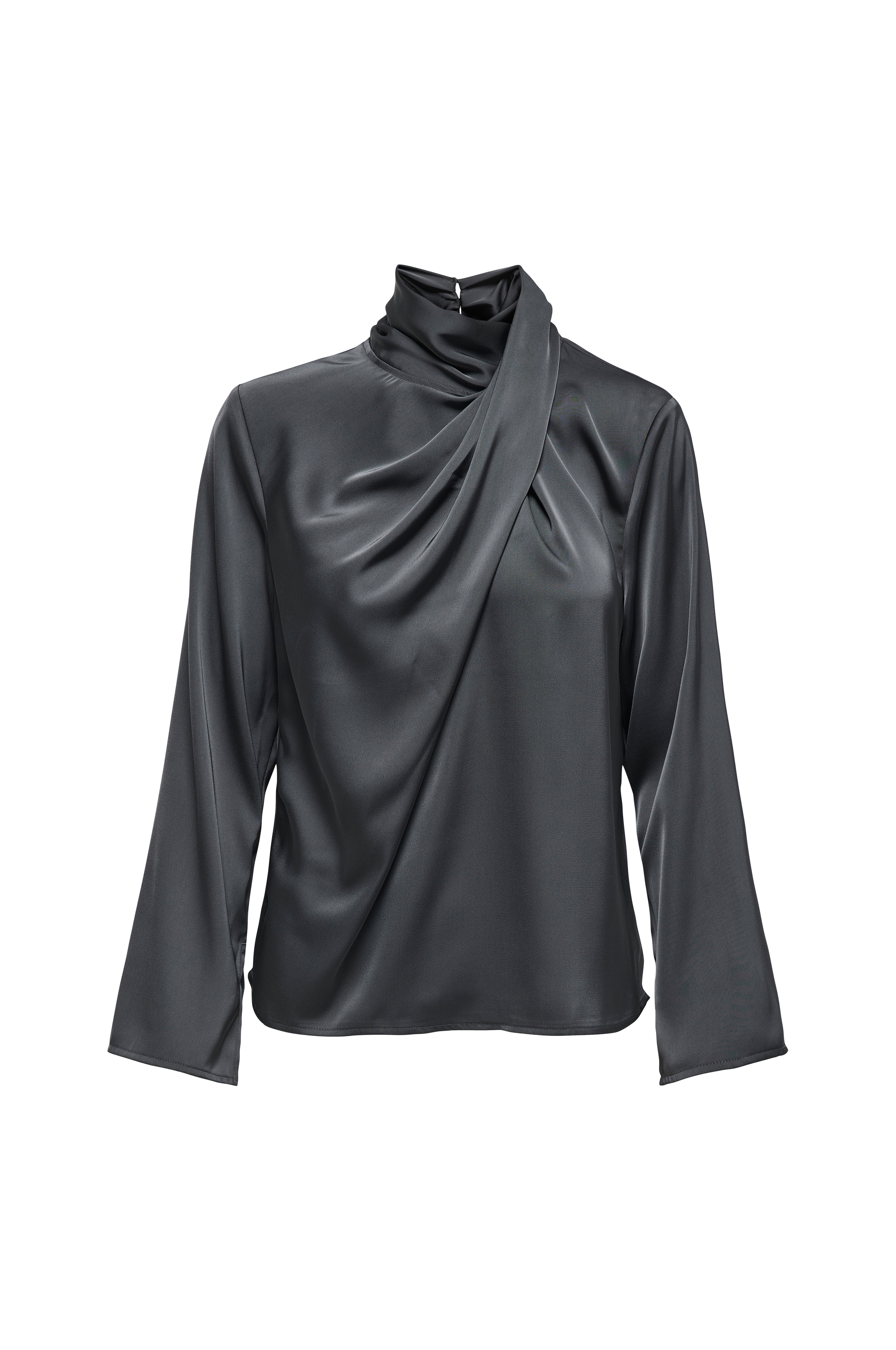 • Pusero satiinista• Korkea kaula-aukko solmudrapeerauksella• Halkio napilla niskan kohdalla
