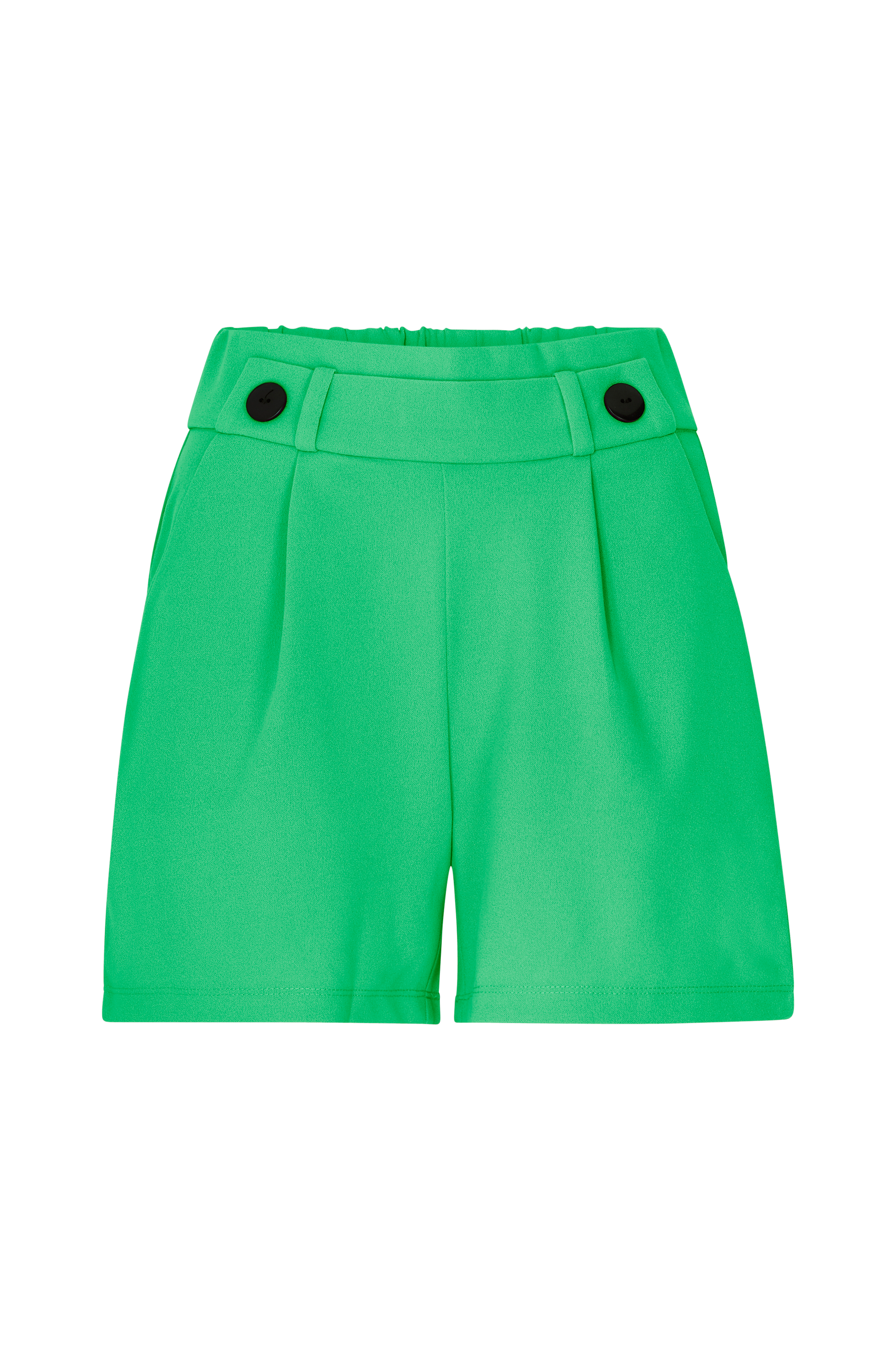 Shortsit trikoota. Lyhyt malli, jossa leveät lahkeet ja sivutaskut. Kuminauha takana vyötäröllä ja ommellut laskokset sekä koristenapit edessä.
