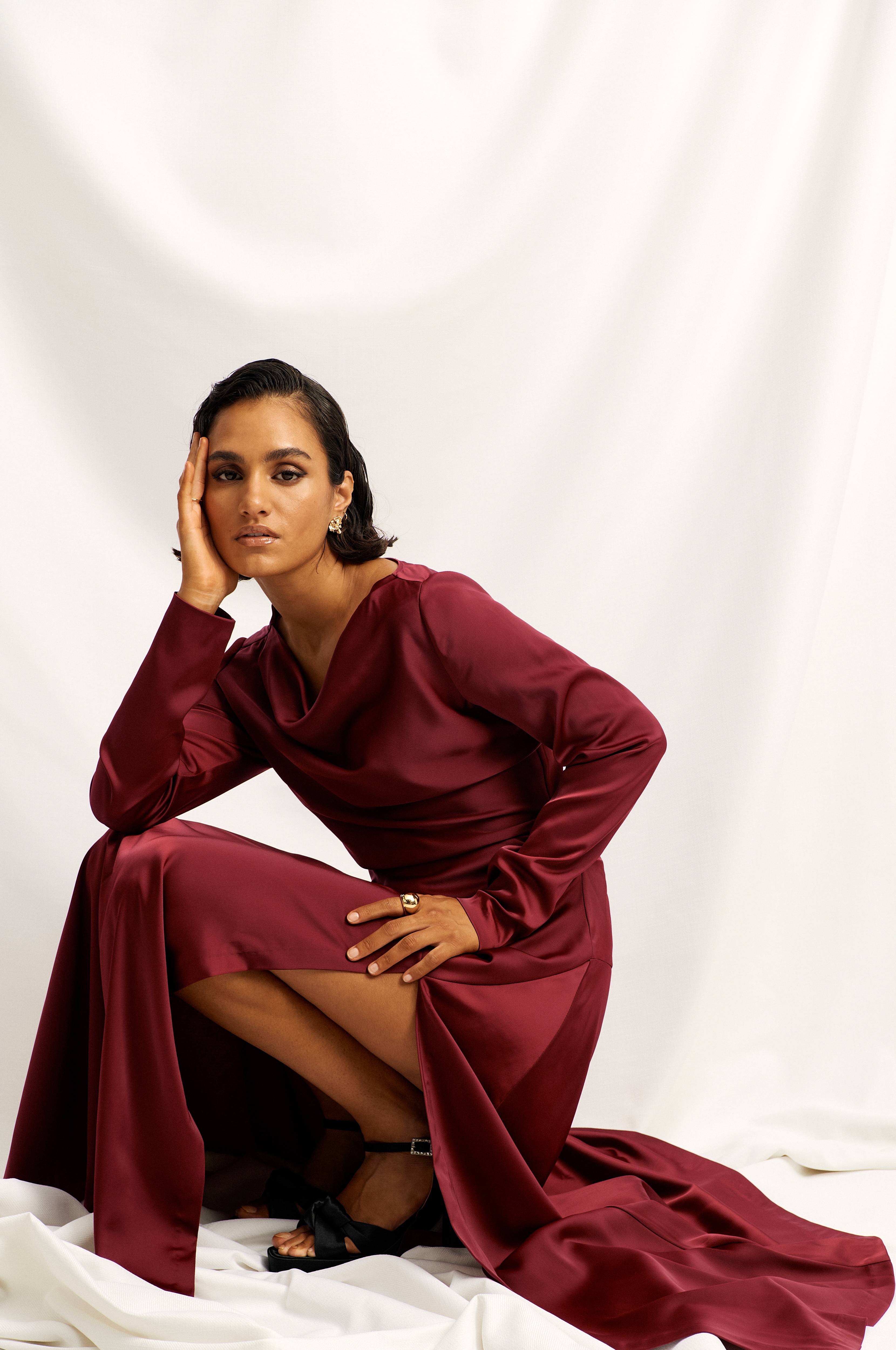 • Pitkä, kevyesti vartalonmyötäinen malli satiinista • Poimutettu kaula • Pitkä hiha • Ommellut drapeeraukset sivuilla • Korkea halkio alhaalla edessä • Pituus: 151 cm koossa 36
