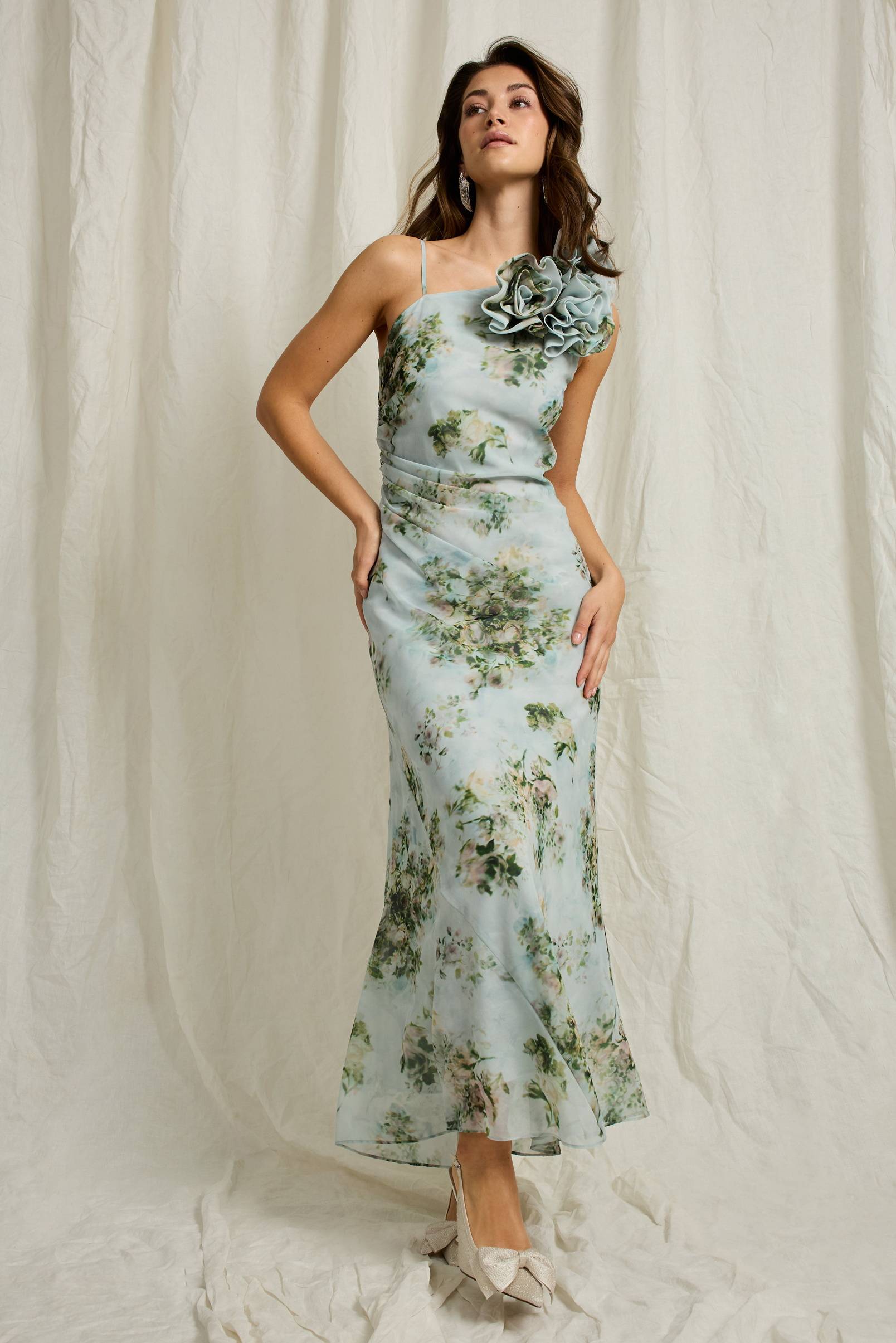 • Pitkä, vuorattu mekko sifongista• Yksi säädettävä olkain• Koristeelliset kukka-applikaatiot• Kätketty vetoketju toisella puolella• Poimutettu poimu toisella puolella• Normaali istuvuus• Pituus: 144 cm koossa S
