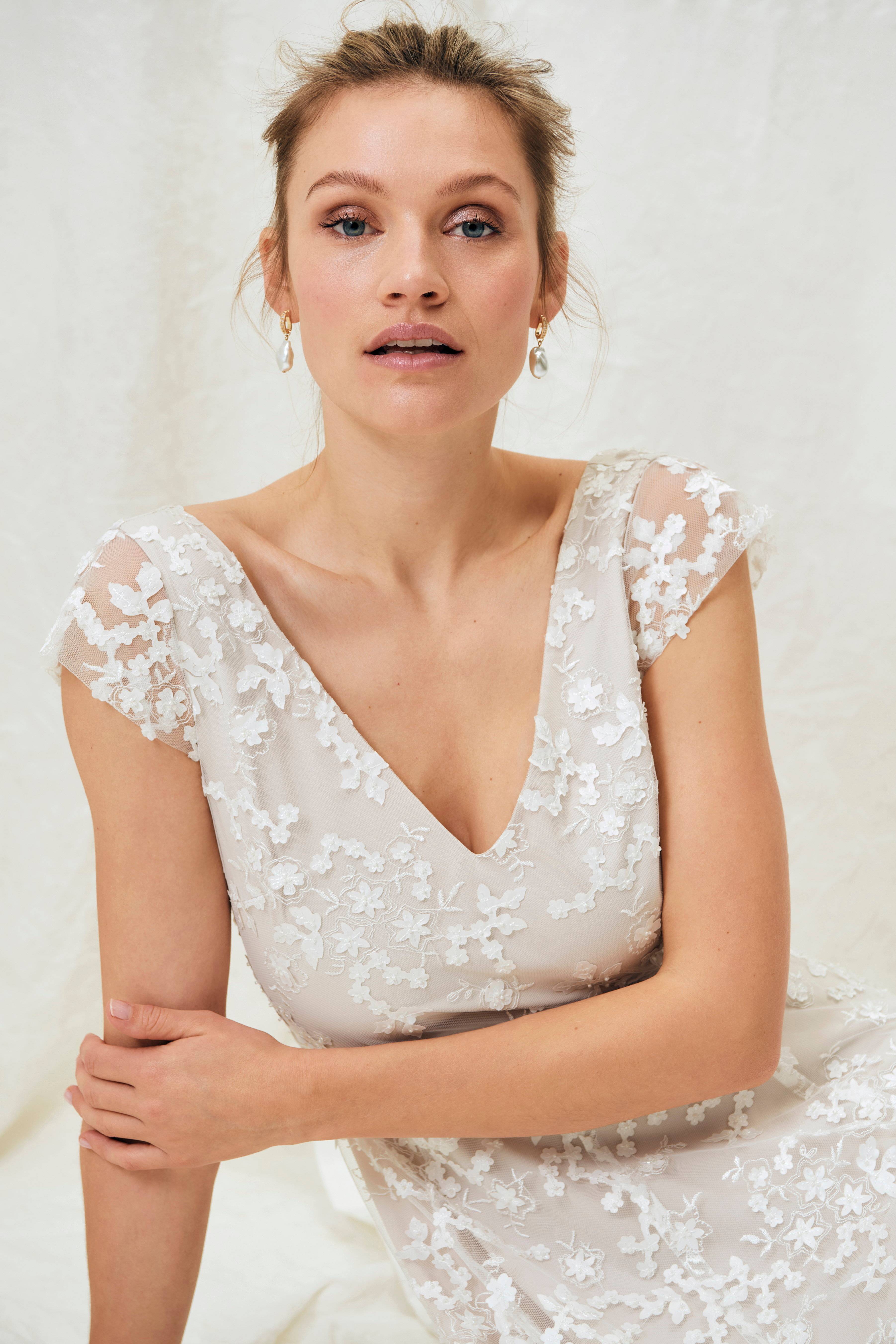 Morsiuspuku harsomaista kangasta, jossa päälleommeltuja kukka-applikointeja ja pieniä helmiä. Samppanjanvärinen vuori kuultaa läpi ja saa valkeat kukat näyttämään ylellisen beigensävyisiltä. Muotoonommeltu yläosa. Edessä V-pääntie, takana syvään uurrettu V-aukko, joka jatkuu piilovetoketjuna. Hameosan alla on tylliä ja lisävuori, jotka tuovat helmaan näyttävää runsautta. Lyhyet holkkihihat ovat vuorittomat. Pituus n. 158 cm koossa 36.