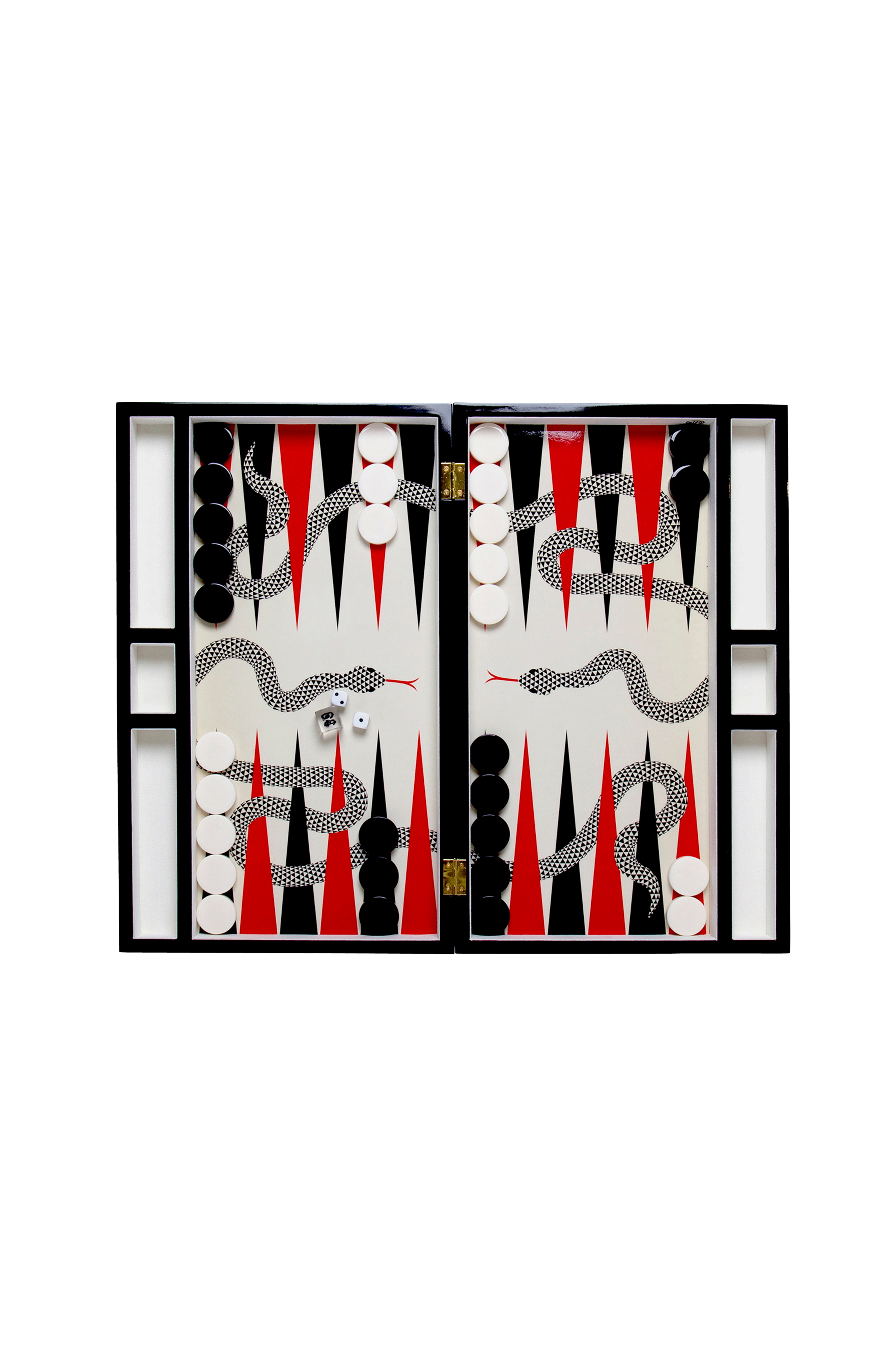 Hurmaa vastustajasi Eden-backgammonsetillä. Korkeakiiltoisessa, lakatussa laatikossa on monimutkainen kuvio kahdesta kiemurtelevasta käärmeestä. Laatikon sisällä on kaunis, klassisen musta, norsunluunvalkoinen ja punainen pelilauta, jossa on kuvio kahdesta käärmeestä. Kokoontaitettuna laatikko on kaunis yksityiskohta sivupöydällä. Mitat avoinna 47x57 cm, korkeus 5,7 cm. Mitat suljettuna 47x28,5 cm, korkeus 11,5 cm.