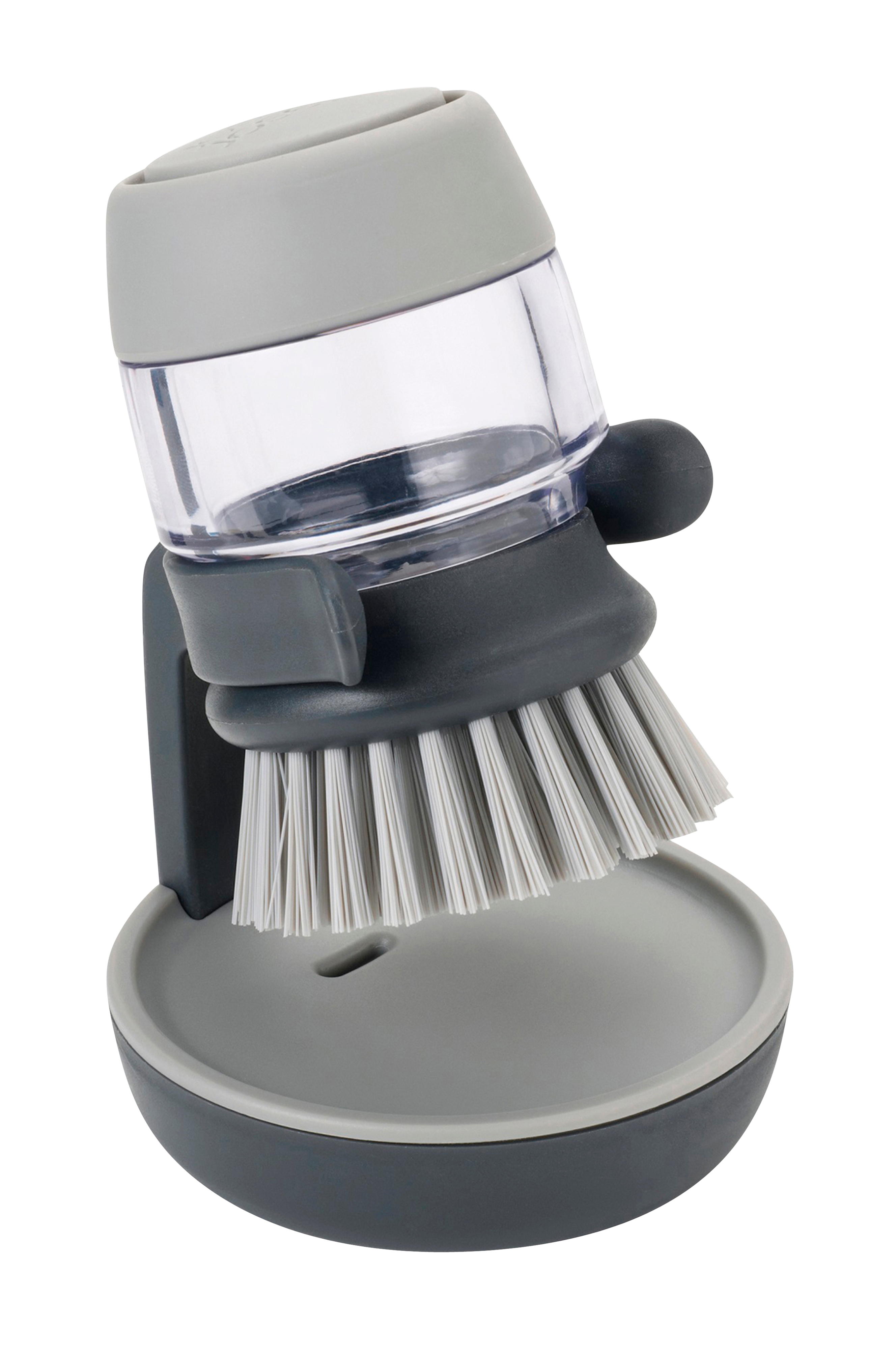 Fiksu ja tehokas astianpesuharja, jossa astianpesuainesäiliö.