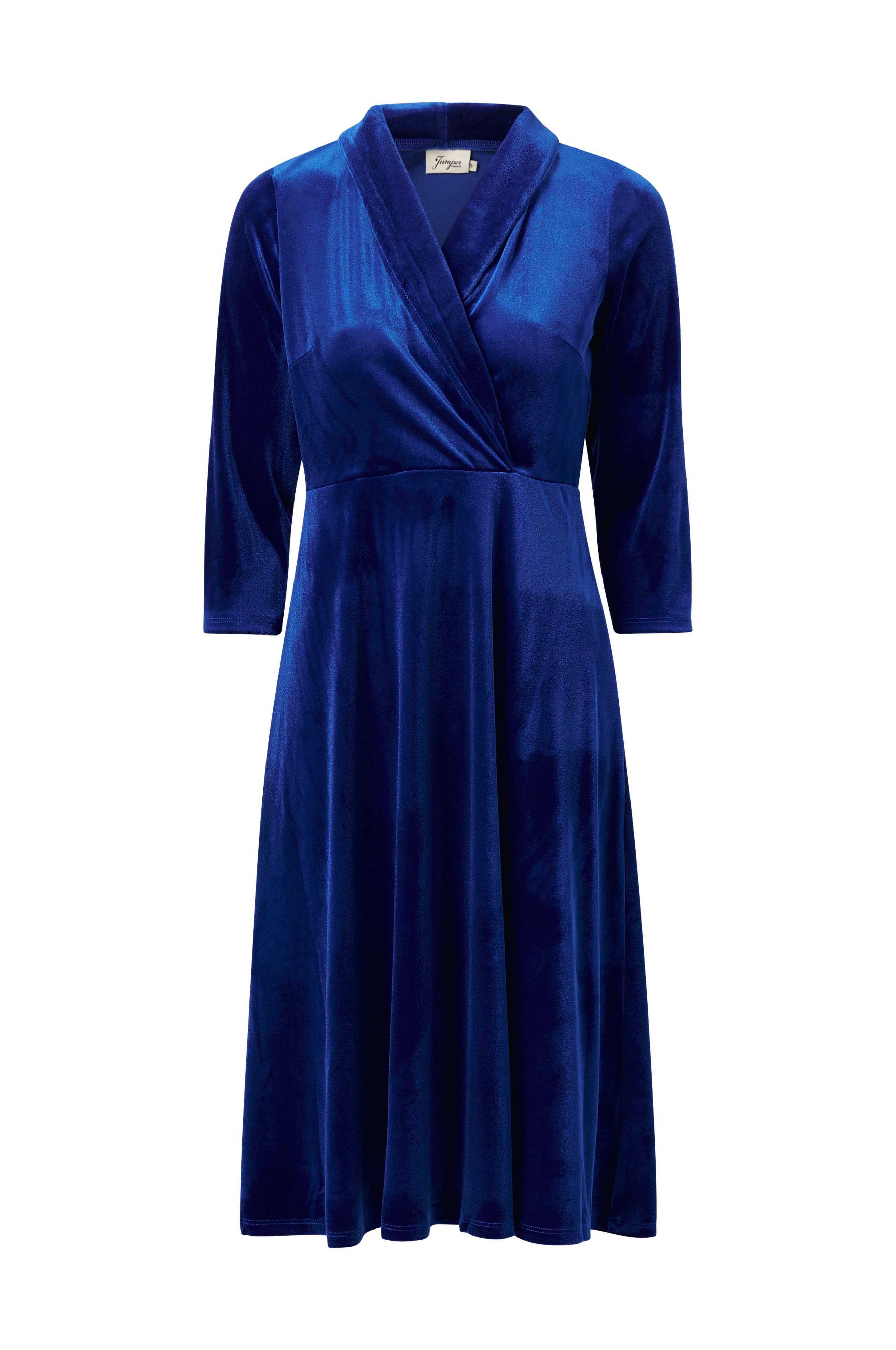 Pehmeä samettimekko, jossa saalikaulus. Kaunis, naisellinen kietaisumalli. Vartalonmyötäinen yläosa ja leveä alaosa. Kapeat 3/4-pituiset hihat. Pituus noin 110 cm koossa S.