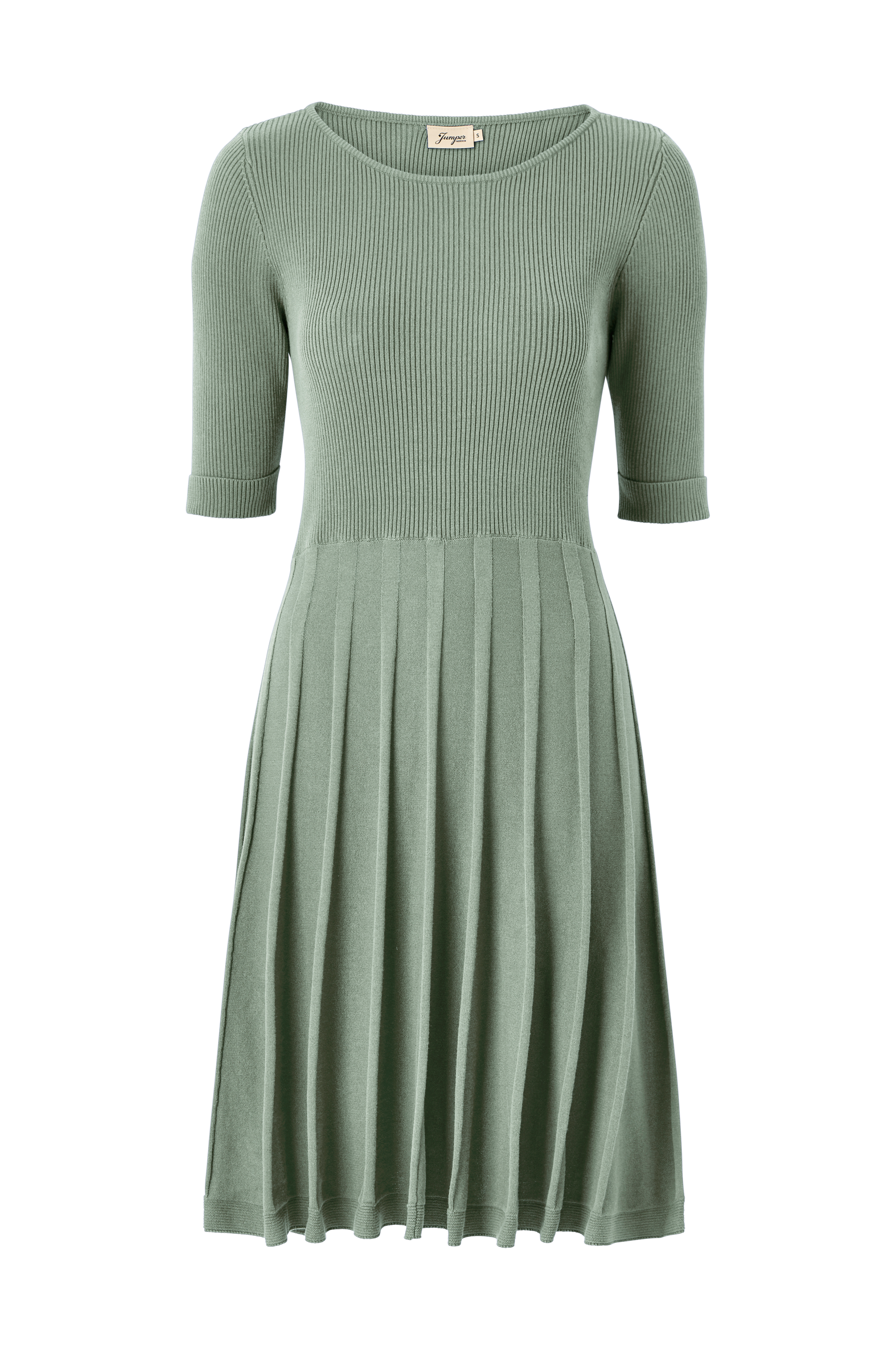 Neulemekko puuvillaa. Yläosa joustinneuletta, lyhyet hihat ja pyöristetty kaulus. Ihanan väljä hameosa on laskostettu. Pituus n. 100 cm koossa S.