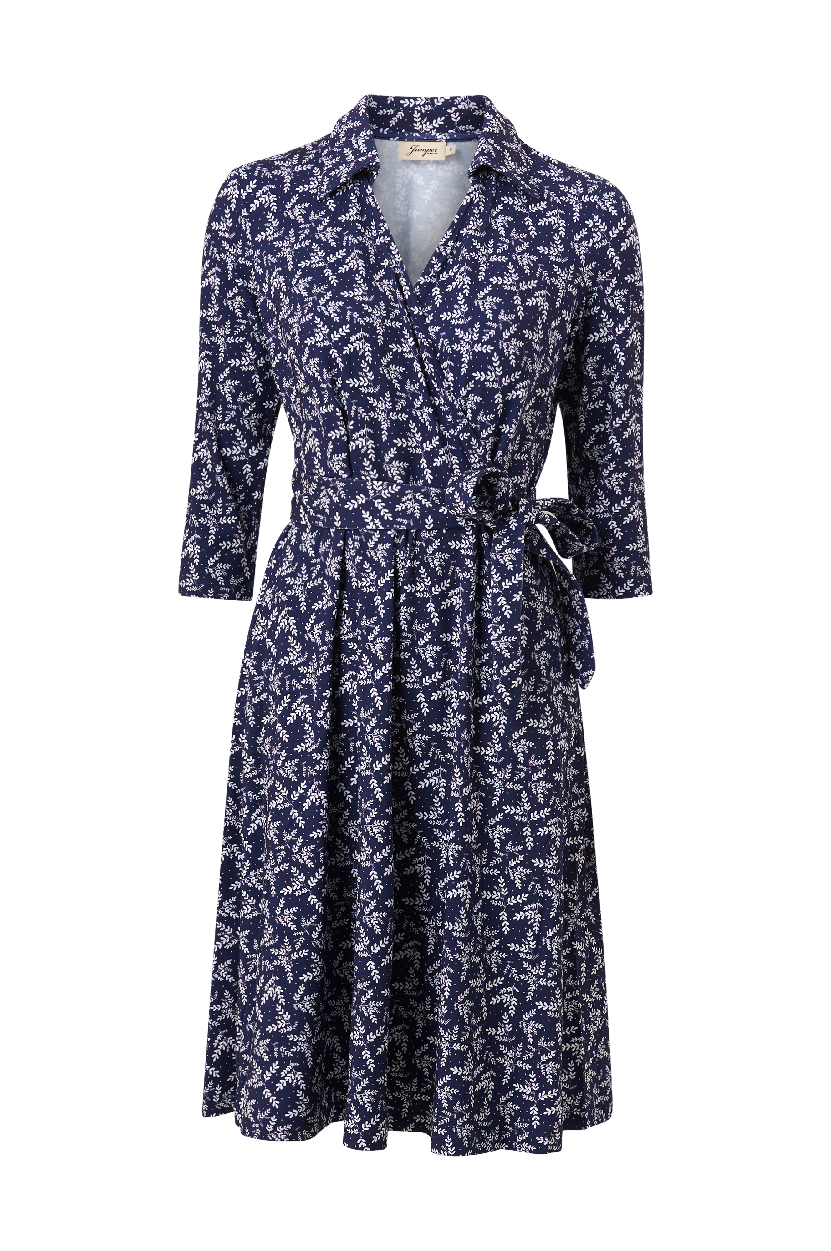 Naisellinen mekko miellyttävää viskoosisekoitetta, jossa lehtikuvio. Vartalonmyötäinen kietaisumallinen etumus, V-pääntie ja kaulus. Kapeat 3/4-pituiset hihat. Yhteensopiva solmimisvyö. Pituus n. 101 cm koossa S.