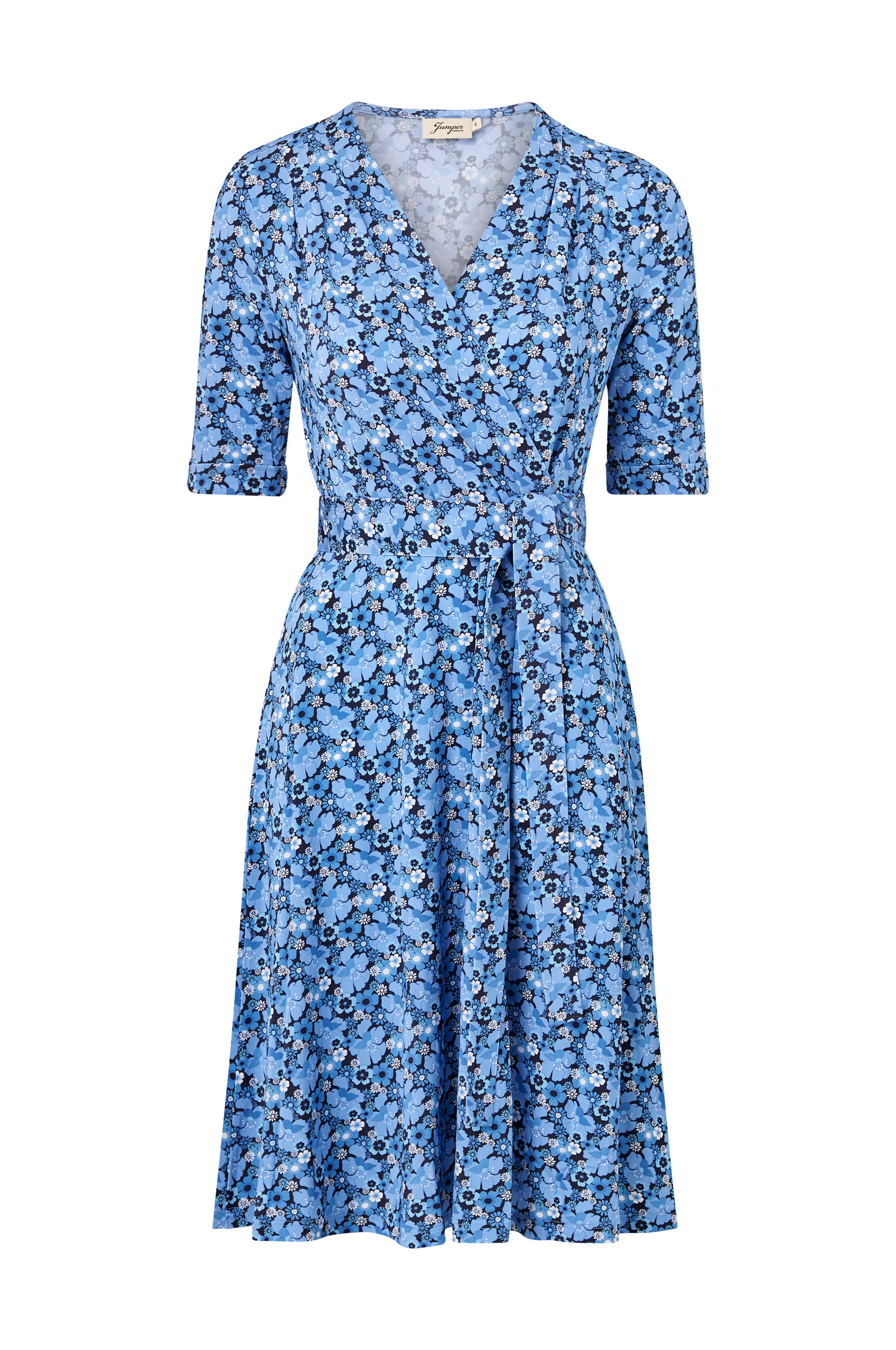 Kukallinen mekko, jonka yläosassa kietaisuleikkaus ja irrotettava vyö vyötäröllä. Leveä hameosa ja hihat, jotka päättyvät juuri kyynärpään yläpuolelle. Koristelaskokset olkasaumoissa. Materiaali on joustavaa ja miellyttävää viskoosisekoitetta, joka laskeutuu raskaasti ja kauniisti. Pituus n. 104 cm koossa S.