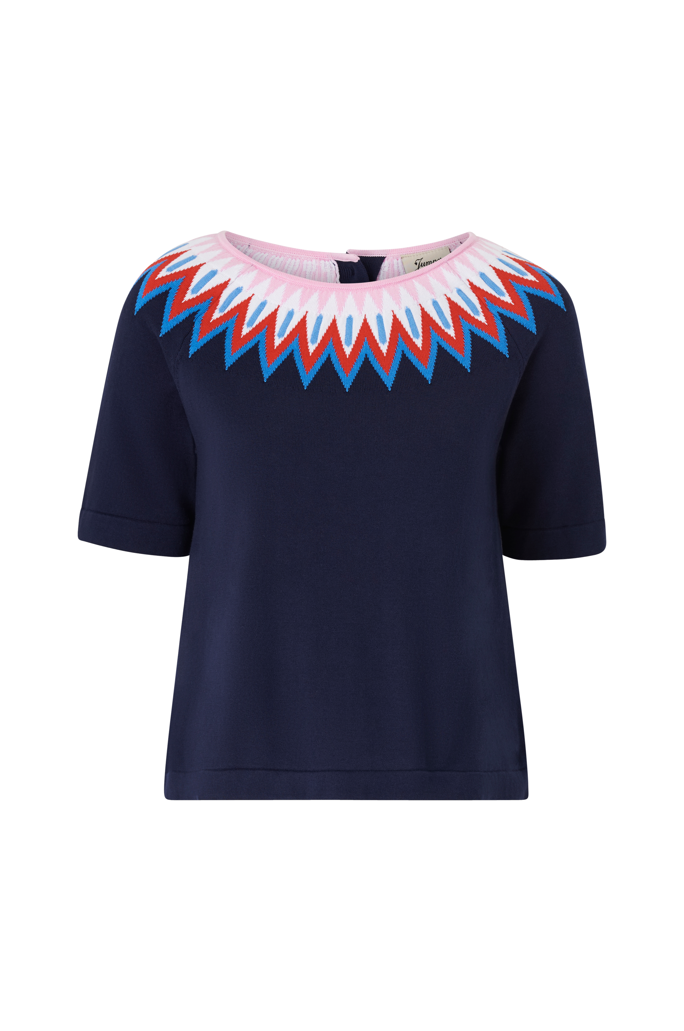 • Neulottu paita puuvillasta lyhyillä hihoilla• A-linjainen leikkaus• Veneen muotoinen kaula-aukko kolmella napilla takaosa• Neulottu kuviointi ympärillä ylhäällä