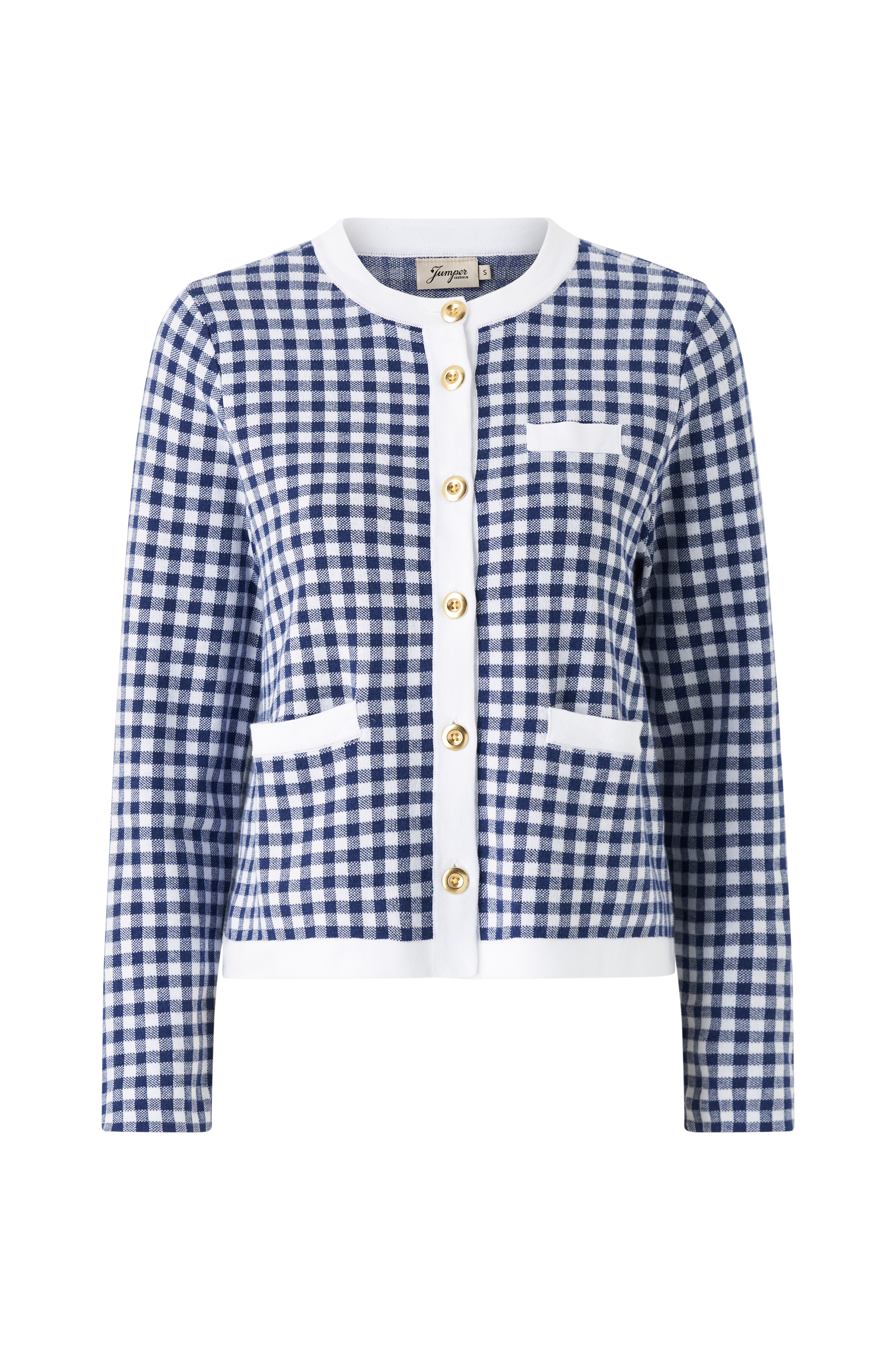 • Lyhyempi, naisellinen takki, jossa on ruutukuvio.• Veneen muotoinen kaula-aukko• Kullanväriset metallinapit• Kaksi taskua• Pehmeä, tiheäsilmukkainen puuvillalaatu• Pituus: 55 cm koossa S