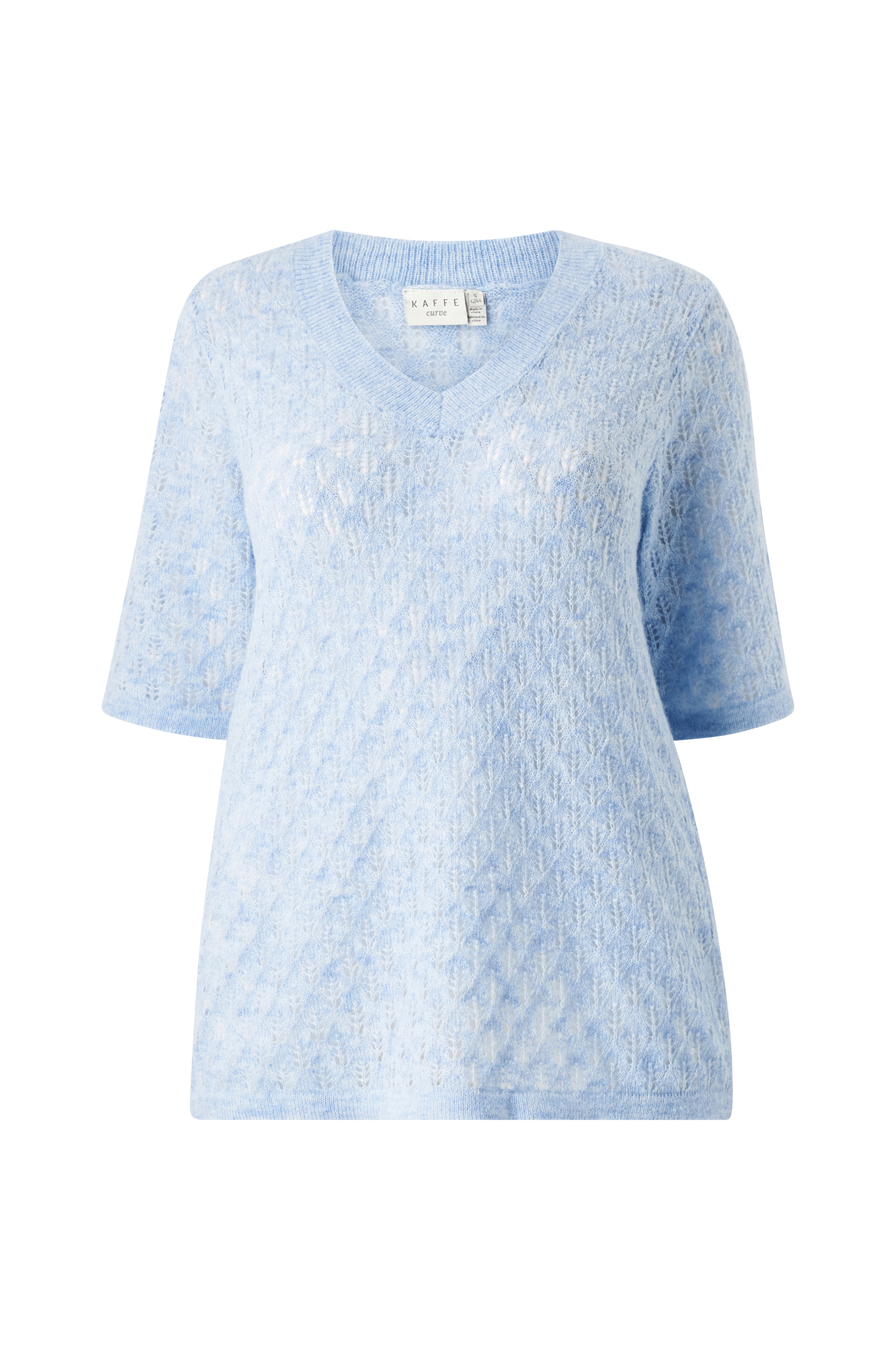• Väljästi kudottu pulloveri lyhyillä hihoilla• Resorimainen, v-muotoinen pääntie• Ribatut reunat manseteilla ja alhaalla• Plus-koot