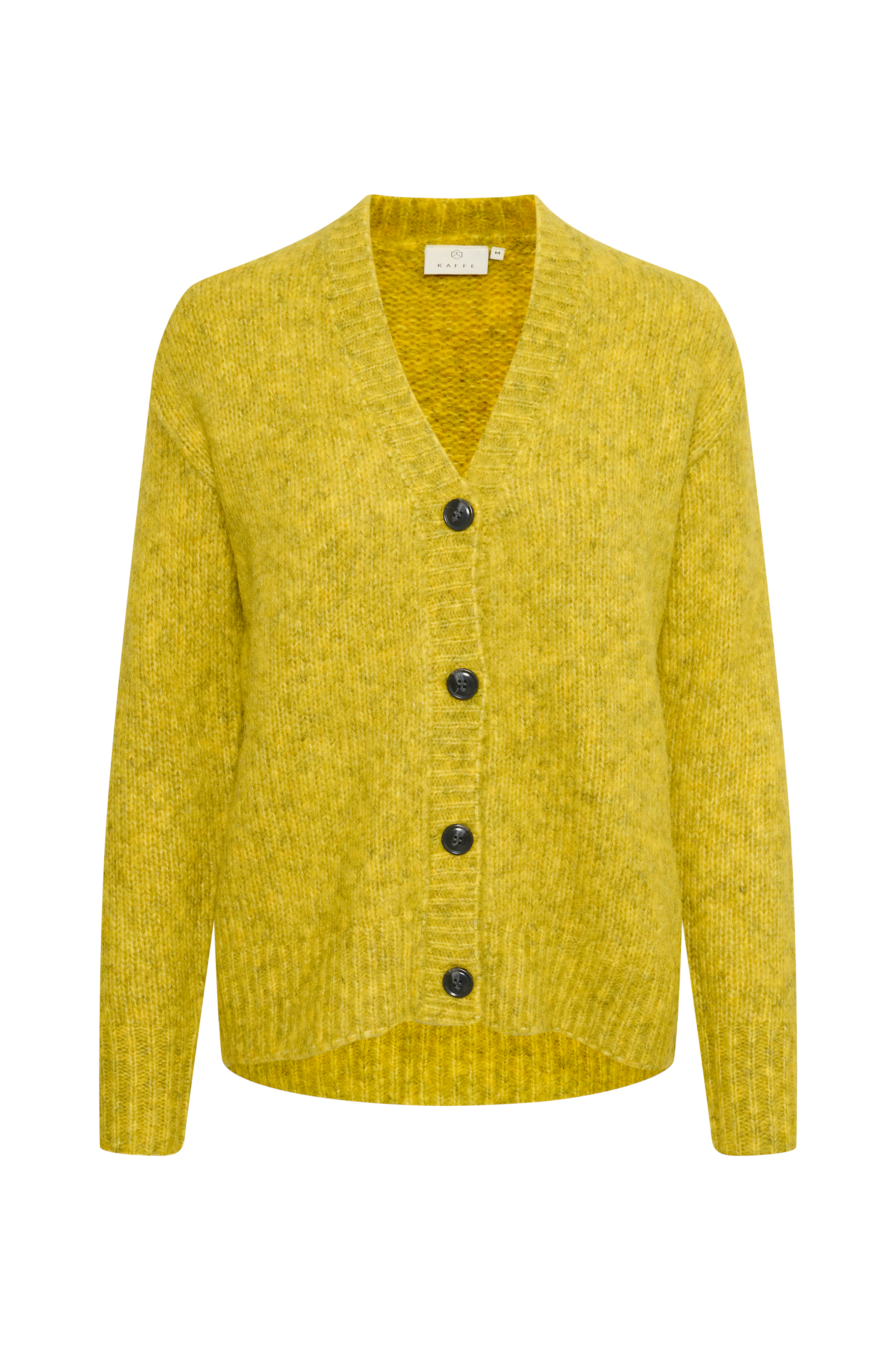Neuletakissa on hieman pörröinen pinta. Edessä V-pääntie ja napit. Madalletut olkapäät.