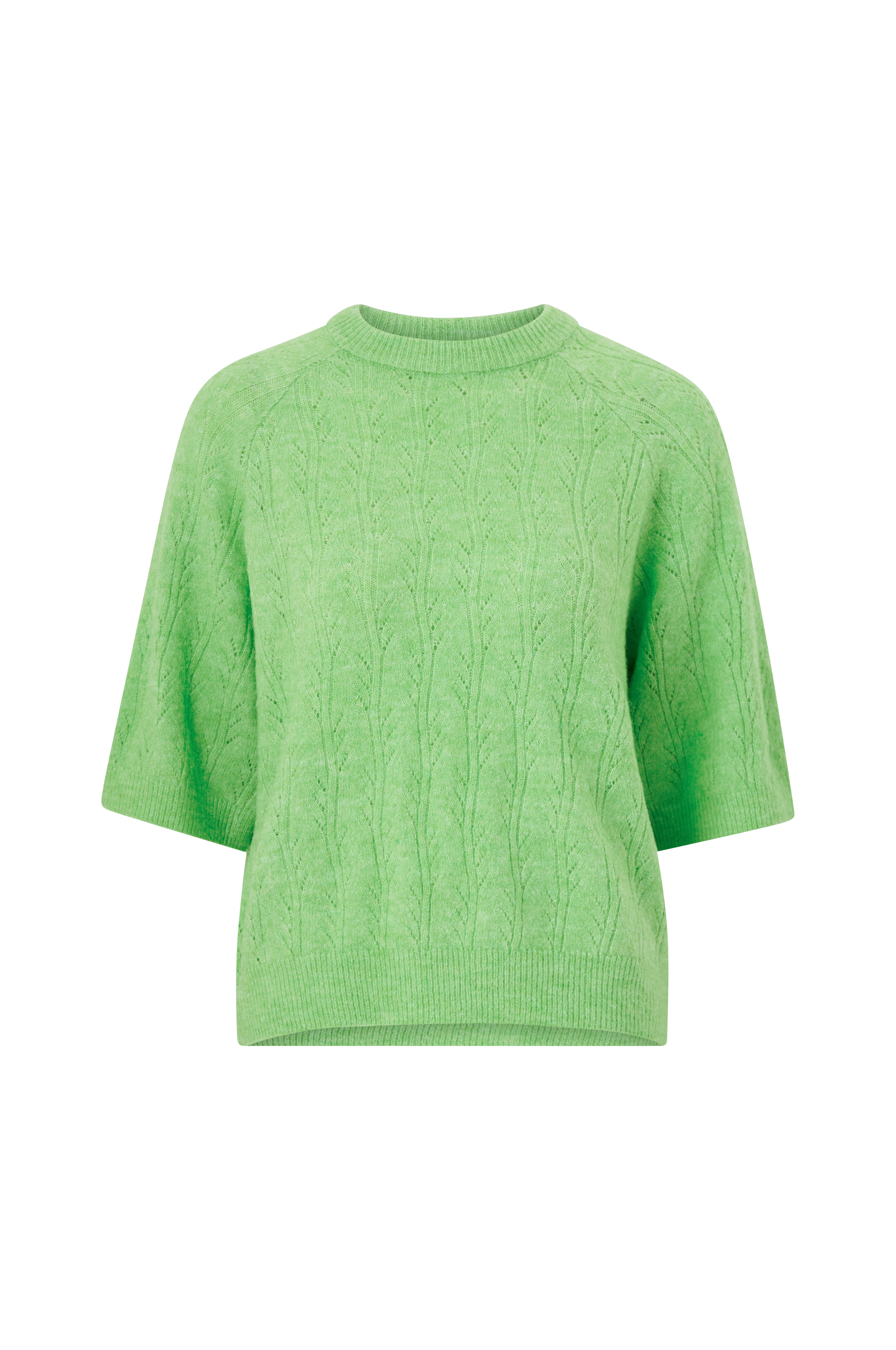 • Tiheäsilmukkainen pulloveri reikäkuvioinnilla• Lyhyet käsivarret pudotetulla olkapäällä ja ribbineuloksella hihansuissa• Pyöristetty, resorimainen pääntie• Ribbineulos alahelmassa
