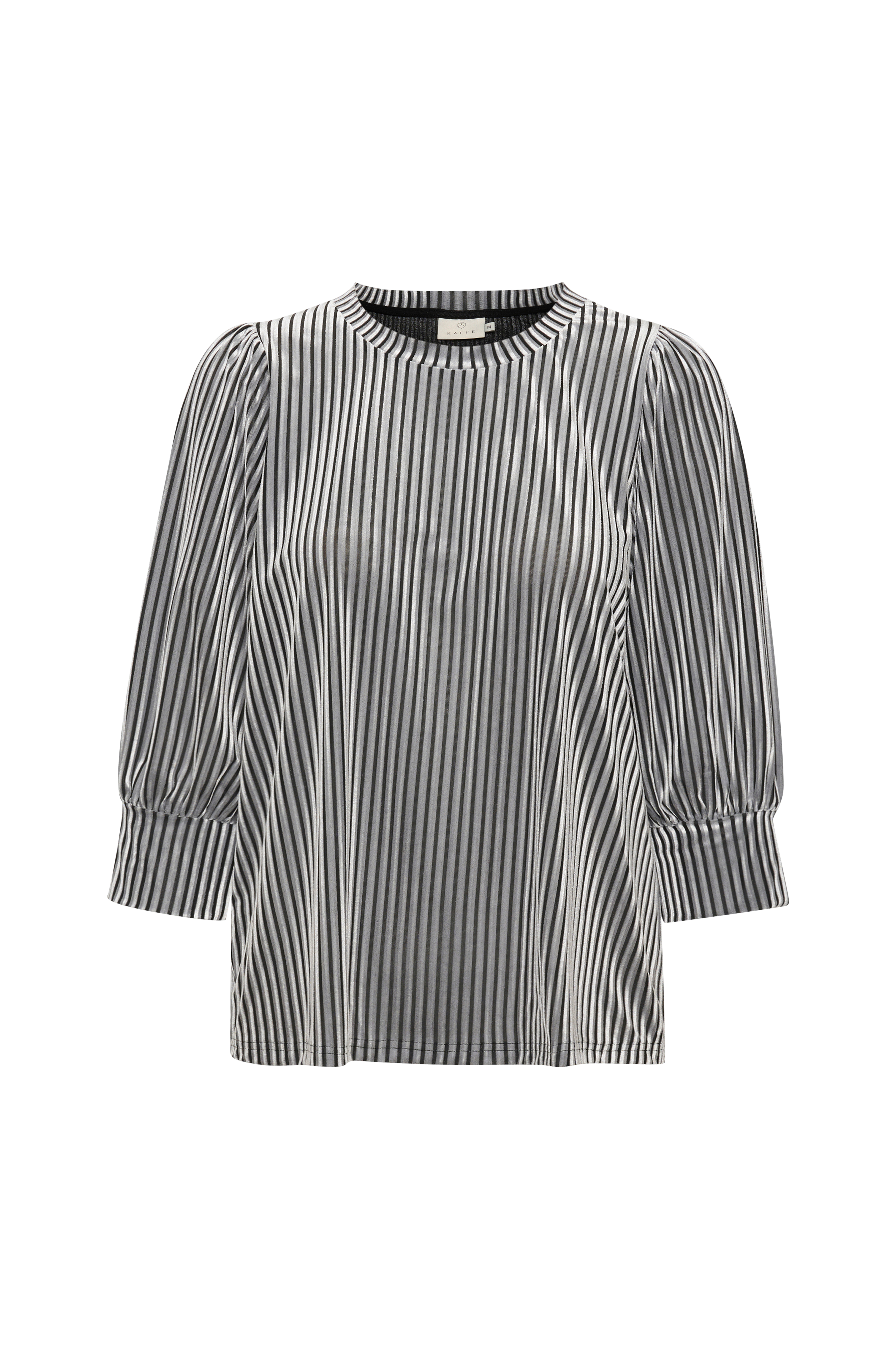Kaffe kaCaca Blouse -pusero. Raitakuosinen veluuripusero. Suora oversize-malli. Pyöreä pääntie, jossa pieni reuna. Väljät puhvihihat, joissa poimutus olkapäillä ja leveä reuna hihansuissa.