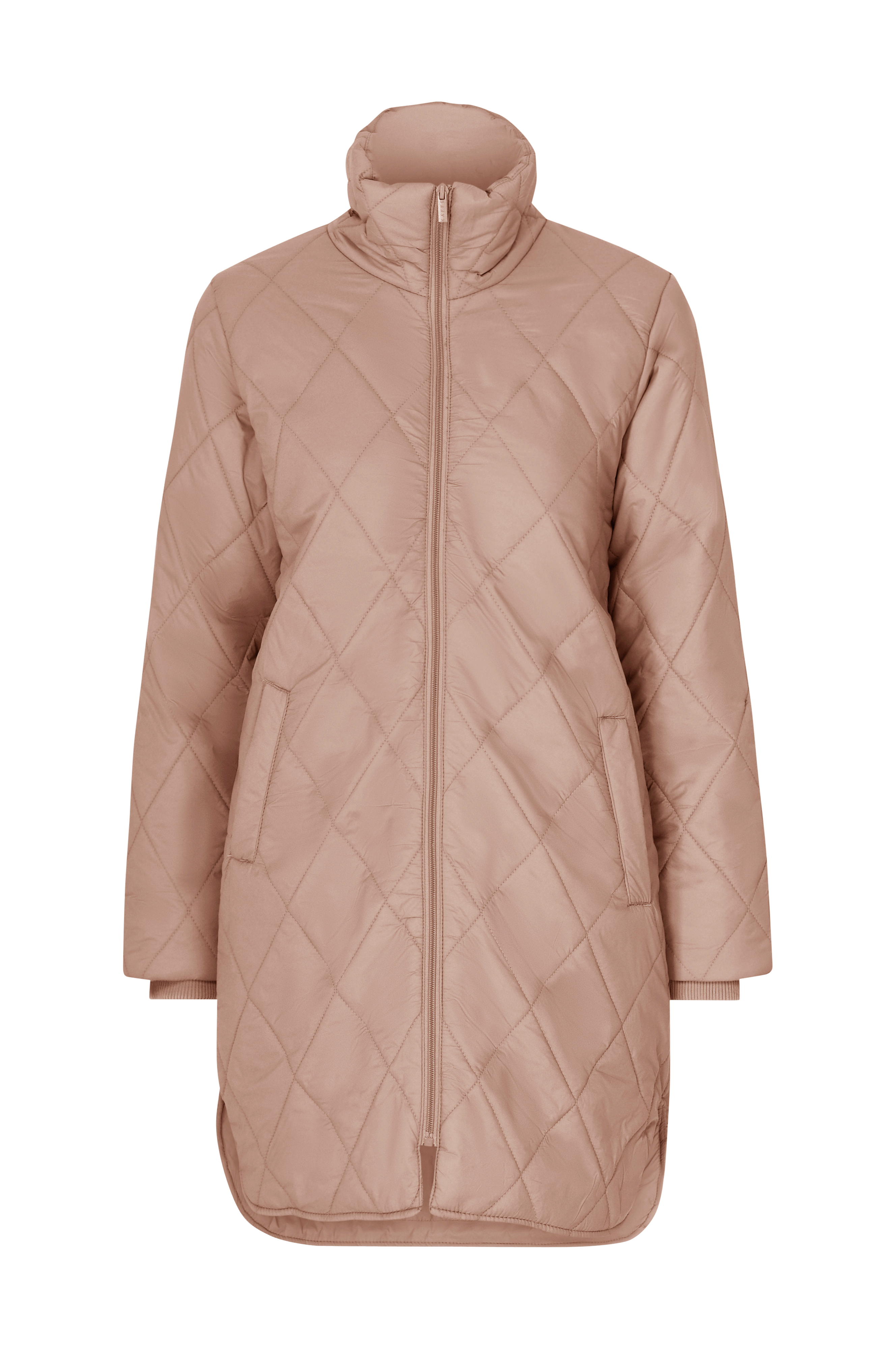 Tikattu takki, jossa toppaus. Edessä vetoketju ja kaksi taskua. Pystykaulus. Piiloresori hihansuissa ja sivuhalkiot helmassa. Pituus n. 87 cm koossa 36.