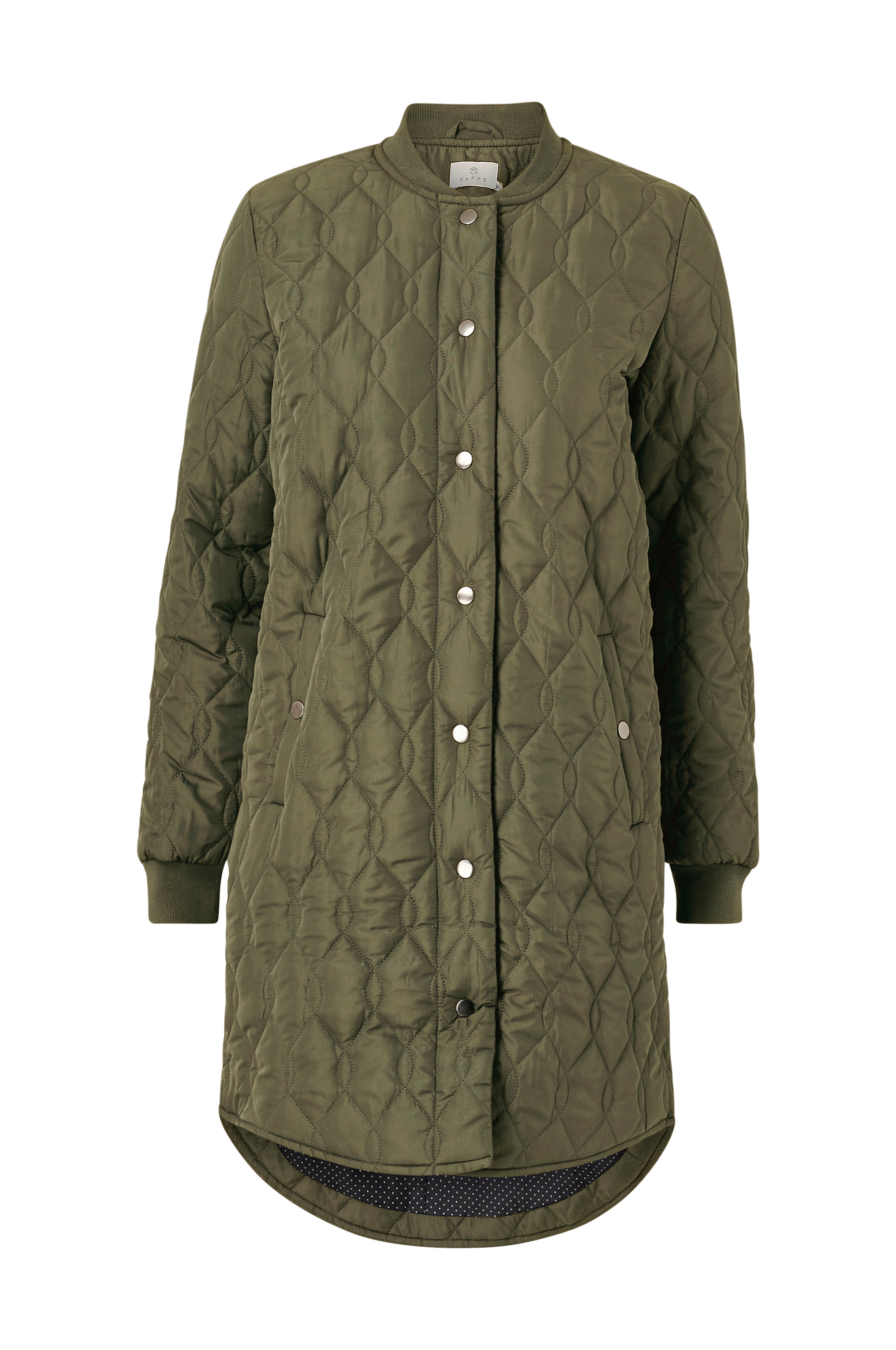 Kaffe kaShally Quilted Coat -takki, jossa tikkaukset ja topattu pilkullinen vuori. Joustinneuloskaulus. Takki suljetaan painonapeilla. Kaksi painonapillista taskua ja hihansuissa resori. Pyöristetty helma takana. Pituus n. 98 cm koossa 36.