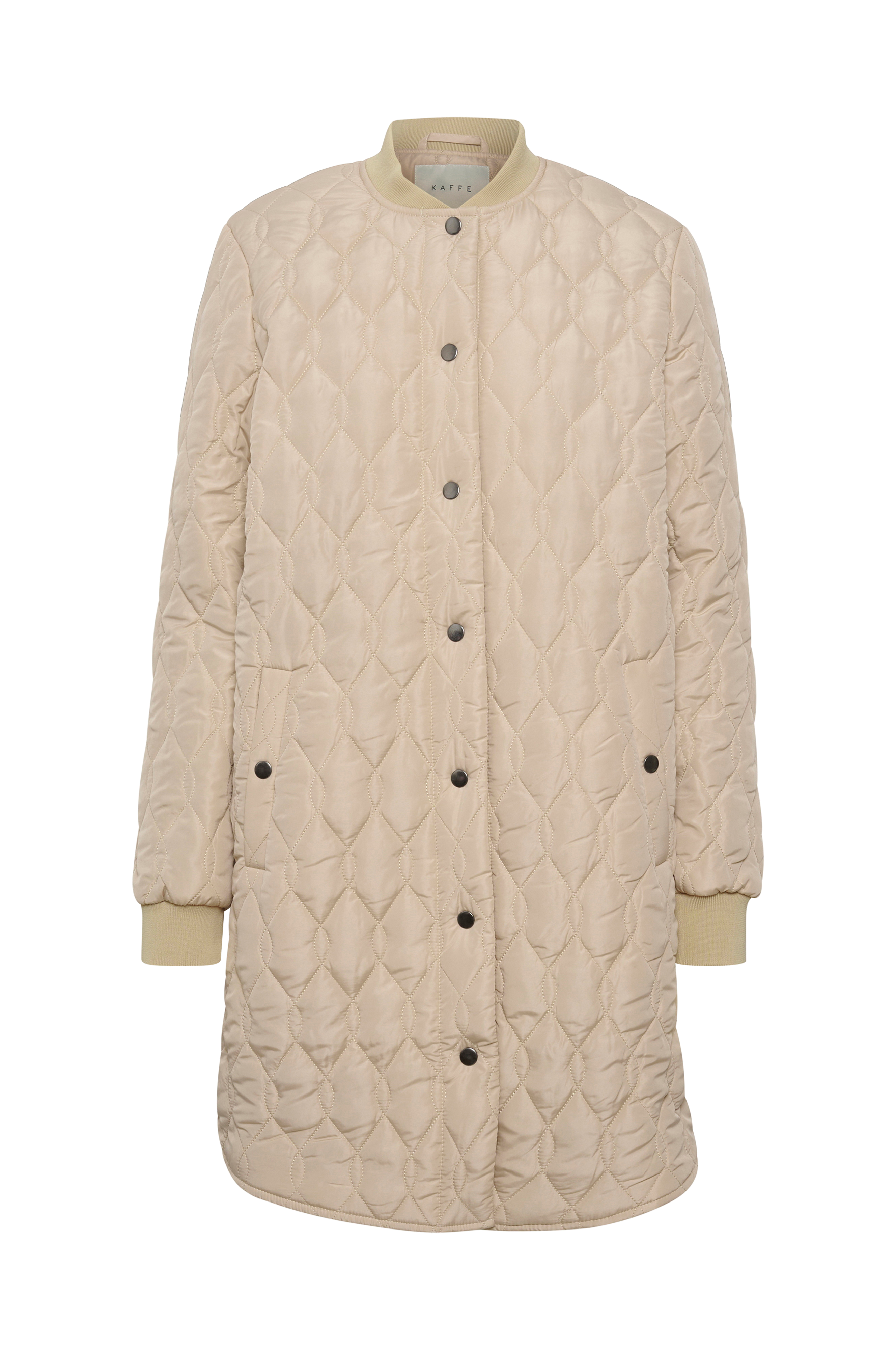 Kaffe kaShally Quilted Coat -takki, jossa tikkaukset ja topattu pilkullinen vuori. Joustinneuloskaulus. Takki suljetaan painonapeilla. Kaksi painonapillista taskua ja hihansuissa resori. Pyöristetty helma takana. Pituus n. 98 cm koossa 36.