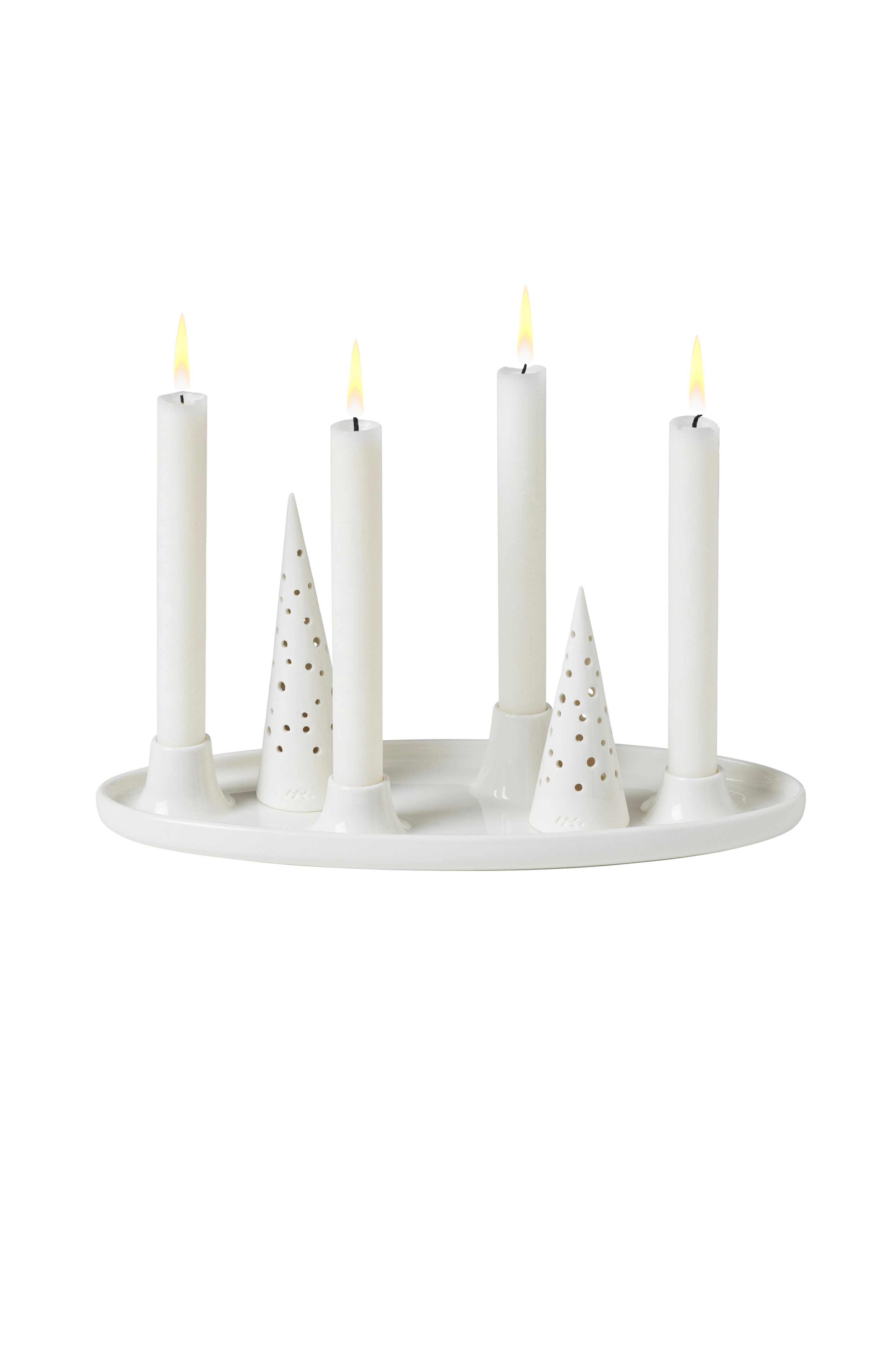 Kaunis Nobili-joulusarja on suunniteltu luomaan joulutunnelmaa olohuoneeseen modernilla ja tyylikkäällä tavalla. Tänä vuonna Nobili-sarja täydentyy vuodenajalle tyypillisellä neljän kynttilän kyntteliköllä. Neljä erikorkuista kynttilänjalkaa, jotka kohoavat soikealta ja kaarevalta alustalta. Se luo vaihtelua ja kiinnittää huomiota, kun kynttilät sytytetään. Kynttelikössä on myös kaksi pientä joulukuusta, jotka koristavat pintaa. Pienet puut, joissa on monta käsin kaiverrettua pientä reikää, ovat vain koristeita, ne ei ole tarkoitettu eläville kynttilöille. Joulukynttelikön soikea muoto näyttää kauniilta keskellä pöytää tai ikkunalaudalla, se on sekä koristeellinen että veistoksellinen. Voit luoda persoonallisen kattauksen yhdessä muiden Nobili-sarjan osien kanssa tai antaa kynttelikön olla koristeena yksinään. Valmistettu luuposliinista, jossa on kiiltävä lumivalkoinen tai oliivinvihreä lasite. Kaikissa joulukuusissa on erikokoisia käsin kaiverrettuja reikiä. Suunnittelija designkaksikko R7B - Mette Bache ja Barbara Bendix Becker.