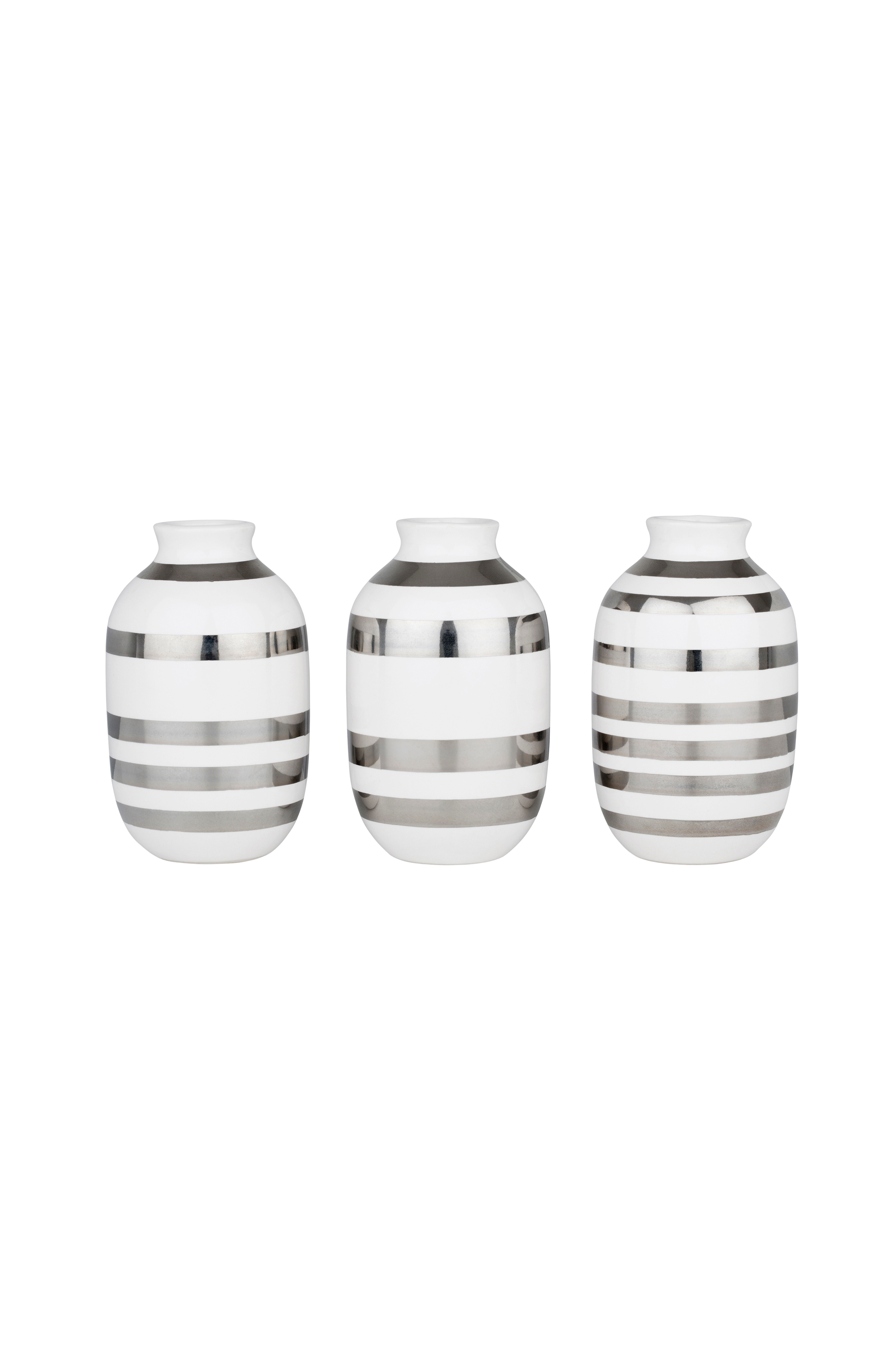 Viimeistele joulutyyli Kählerin ikonisilla, perinteisin käsityötekniikoin tuotetuilla Omaggio-raidoilla. Omaggio-sarjan hienot hopeanhohtoiset pienoismaljakot sopivat hyvin yhteen klassisten jouluvärien kanssa. Aseta maljakoihin kuusenoksia tai muita oksia ja ripusta oksille pieniä joulukuusenpalloja. Luo tyylikäs pieni asetelma näistä kolmesta maljakosta.