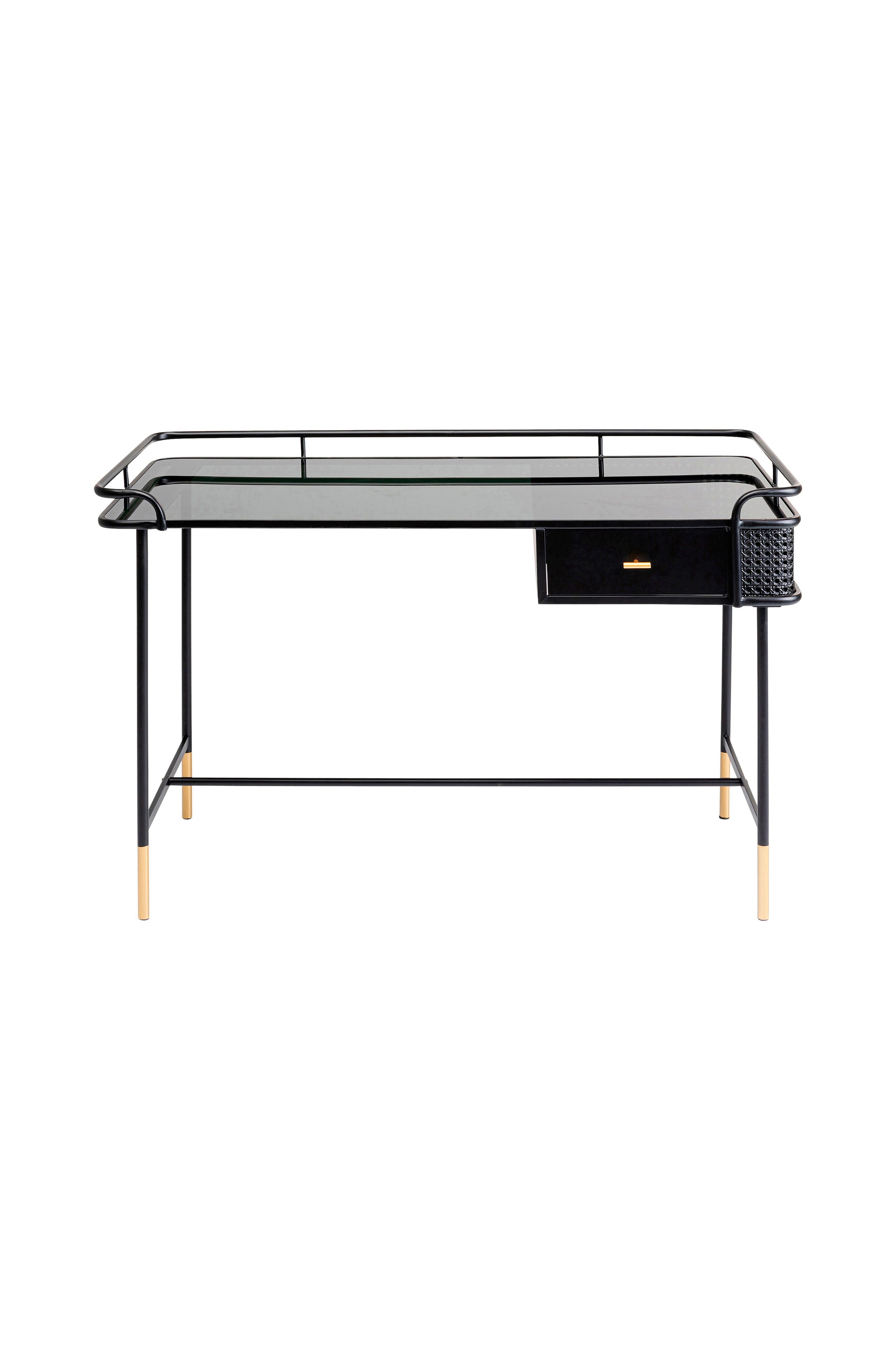 Rottinkia edessä ja sivuilla. Kalusteessa on sekä sileitä maalattuja teräspintoja että lasia ja teräksestä valmistettuja, rottinkia muistuttavia osioita. Vetimissä ja jaloissa on hienostunutta retrohenkeä luova messinkiviimeistely.