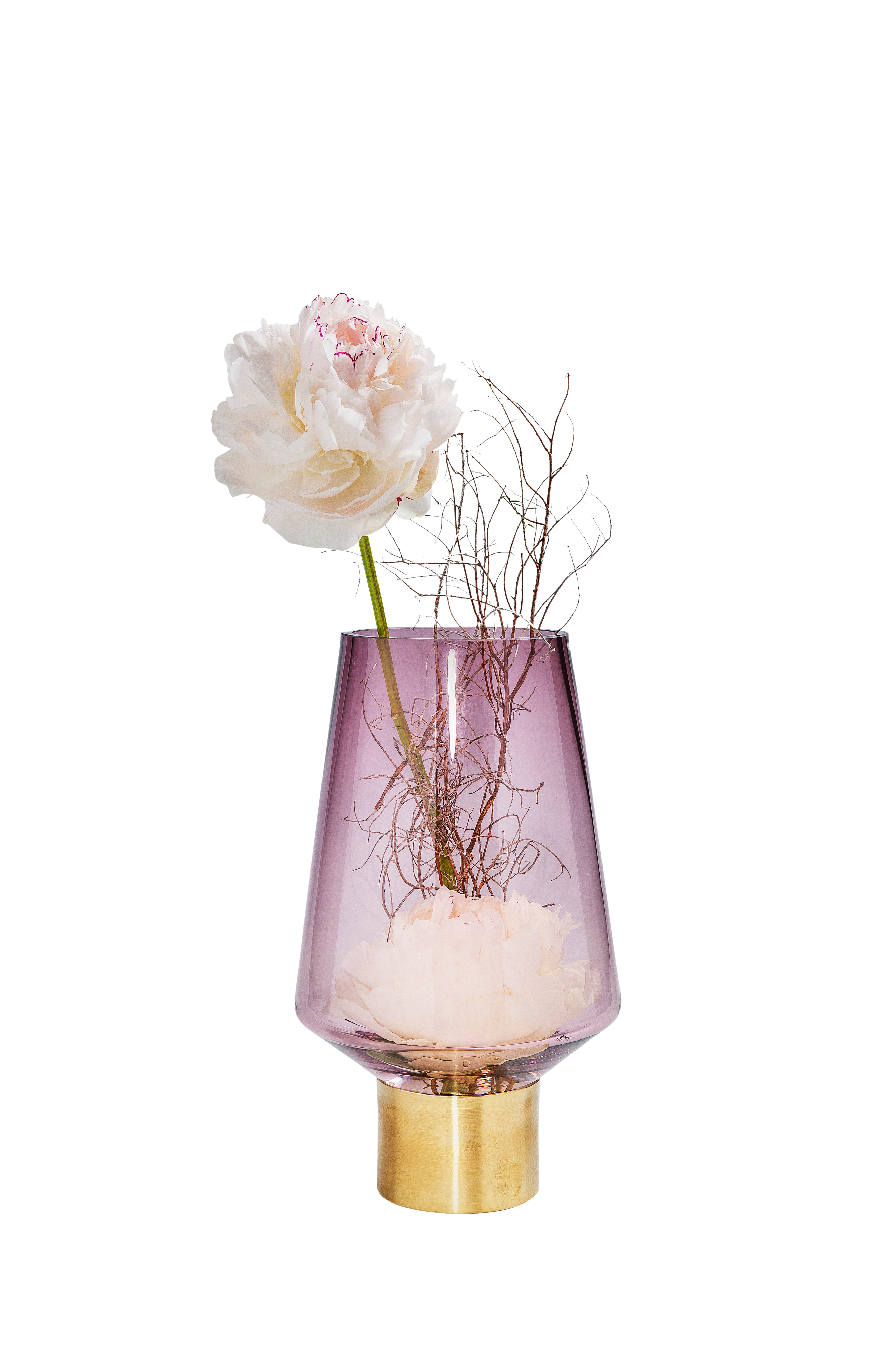 Kauniin liila, käsintehty maljakko, jossa messingillä päällystetty jalusta. Lasimaljakko on muotoilun ihme ja erottuu laatikollisen lipaston päällä myös ilman kukkia. Täydellinen kumppani sisustuksessa muille messinkiesineille.