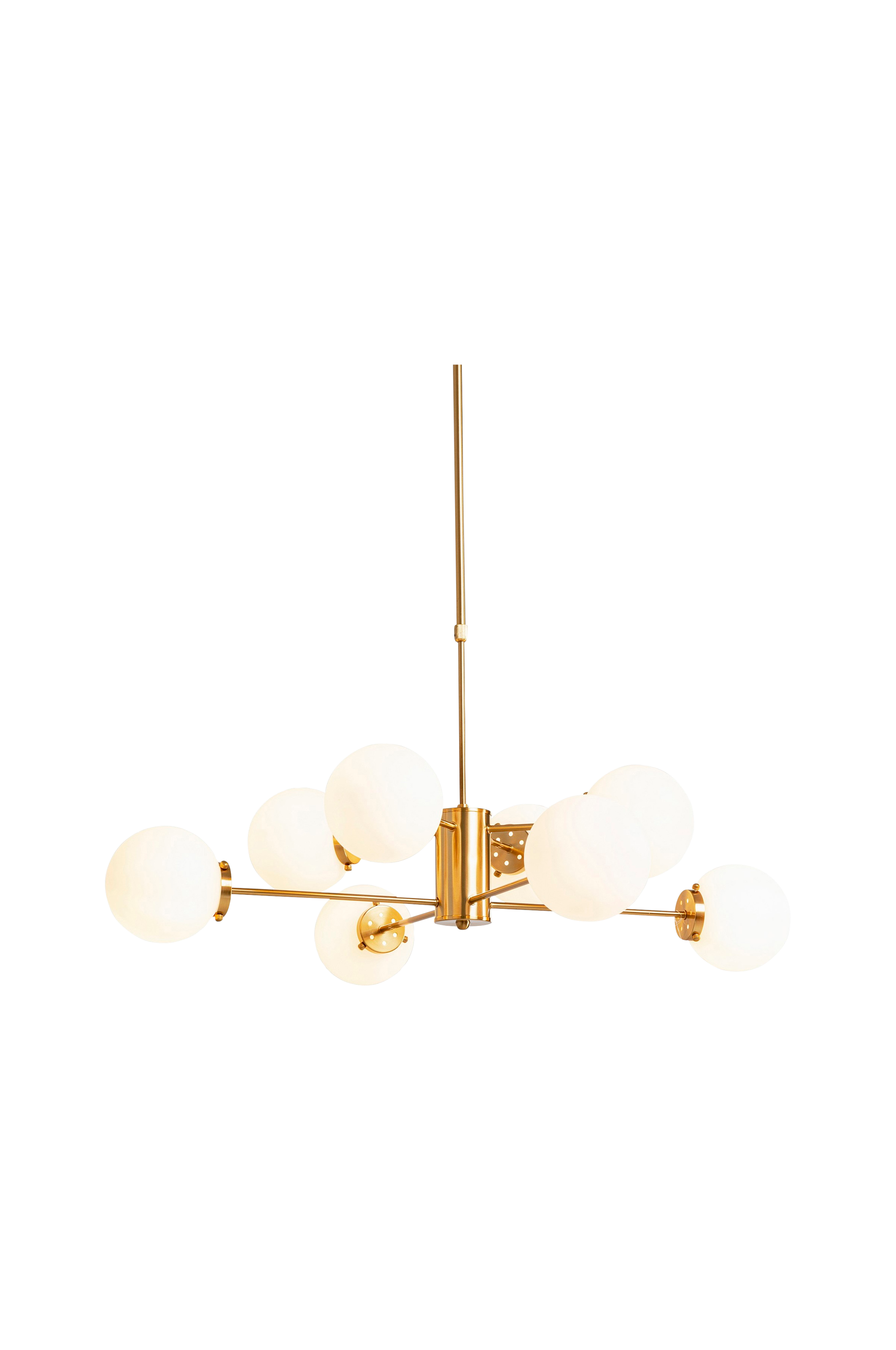 Kuin aurinkoa kiertävät planeetat, pehmeän valkoiseen kylpevät lasipallot ympäröivät tätä valaisinta, jossa on kullanvärinen messinkiviimeistely. riippuvalaisin kruunaa ruokapöydän loistokkaasti, ja sen korkeutta on helppo säätää. Makuuhuoneessa se säteilee harmoniaa ja pehmeää valoa.