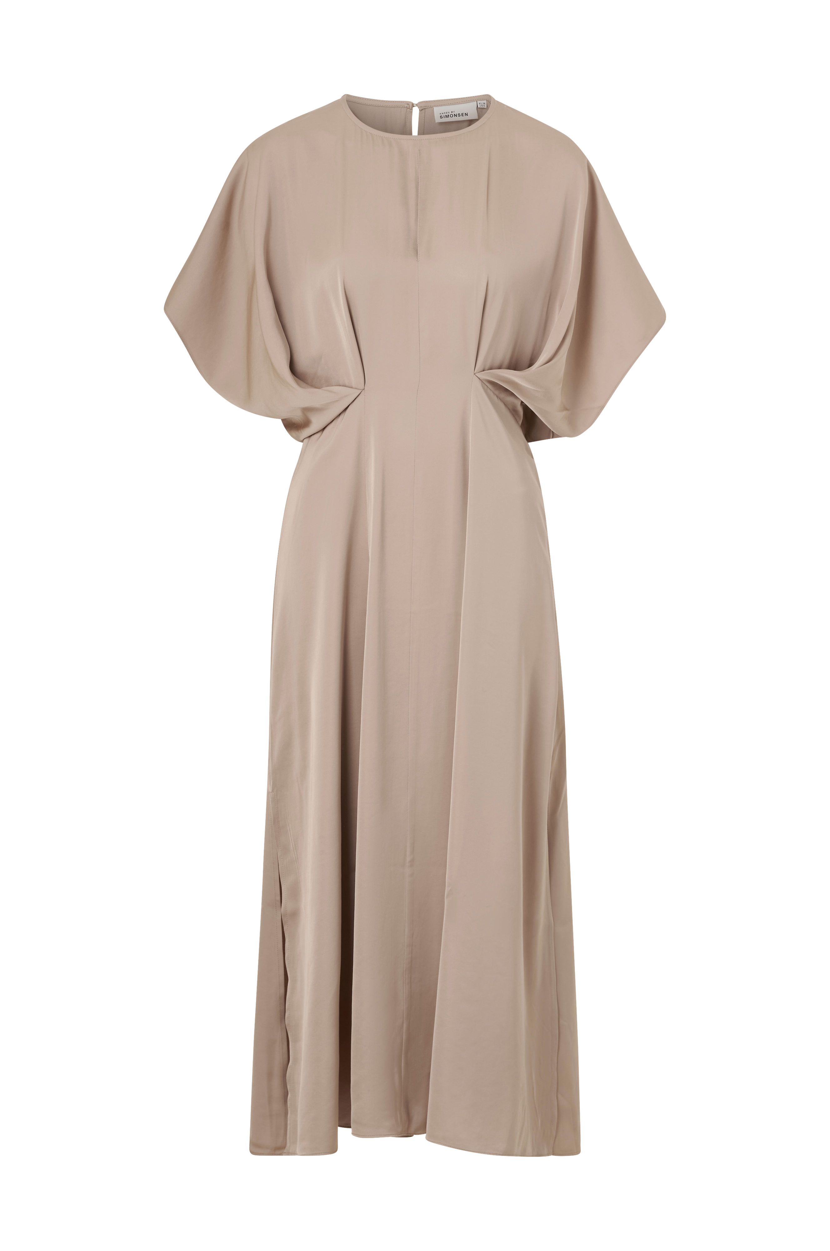 • Pitkä malli satiinista• Pyöreä pääntie pienellä halkiolla edessä ja niskan kohdalla• Lyhyt, poimutettu hiha• Korkeat halkiot alhaalla sivuilla• Pituus: 130 cm koossa 36