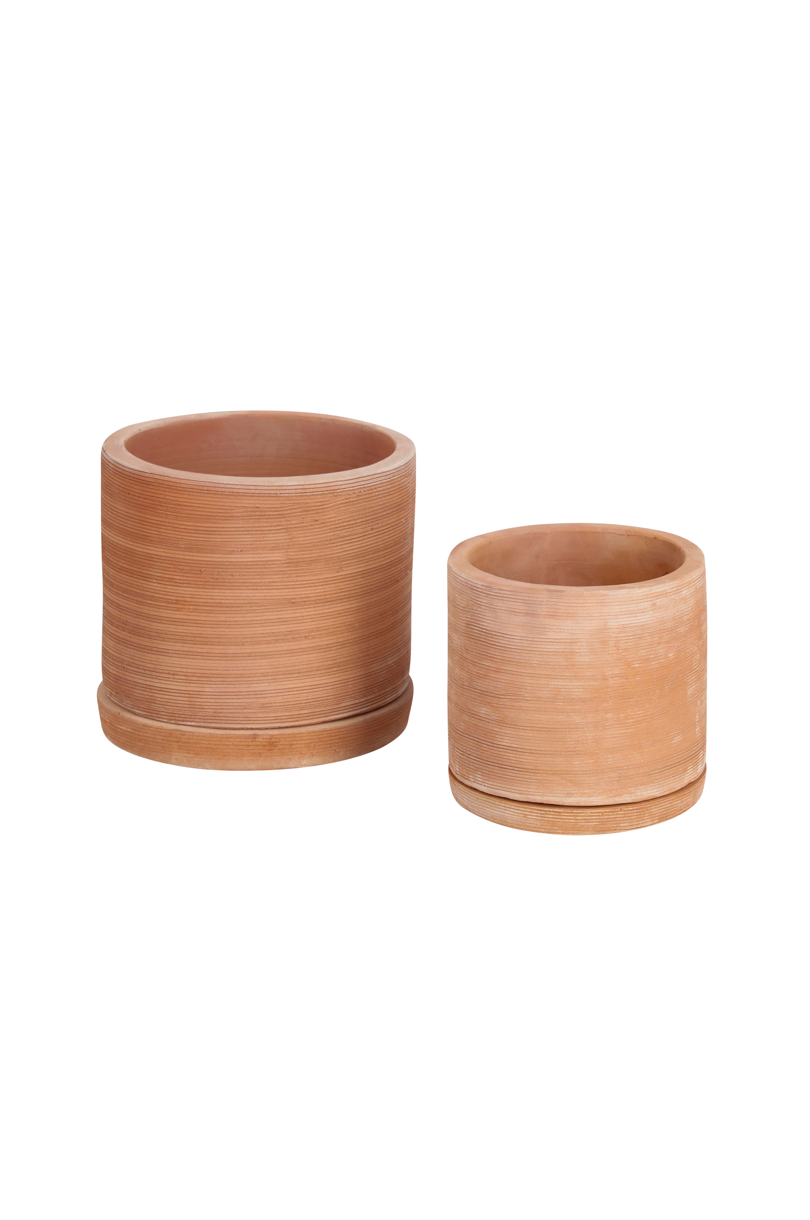 Karlina 2 krukor med fat av terrakotta. Stora krukan diameter 33 cm, höjd 35 cm. Lilla krukan diameter 33 cm, höjd 27 cm.