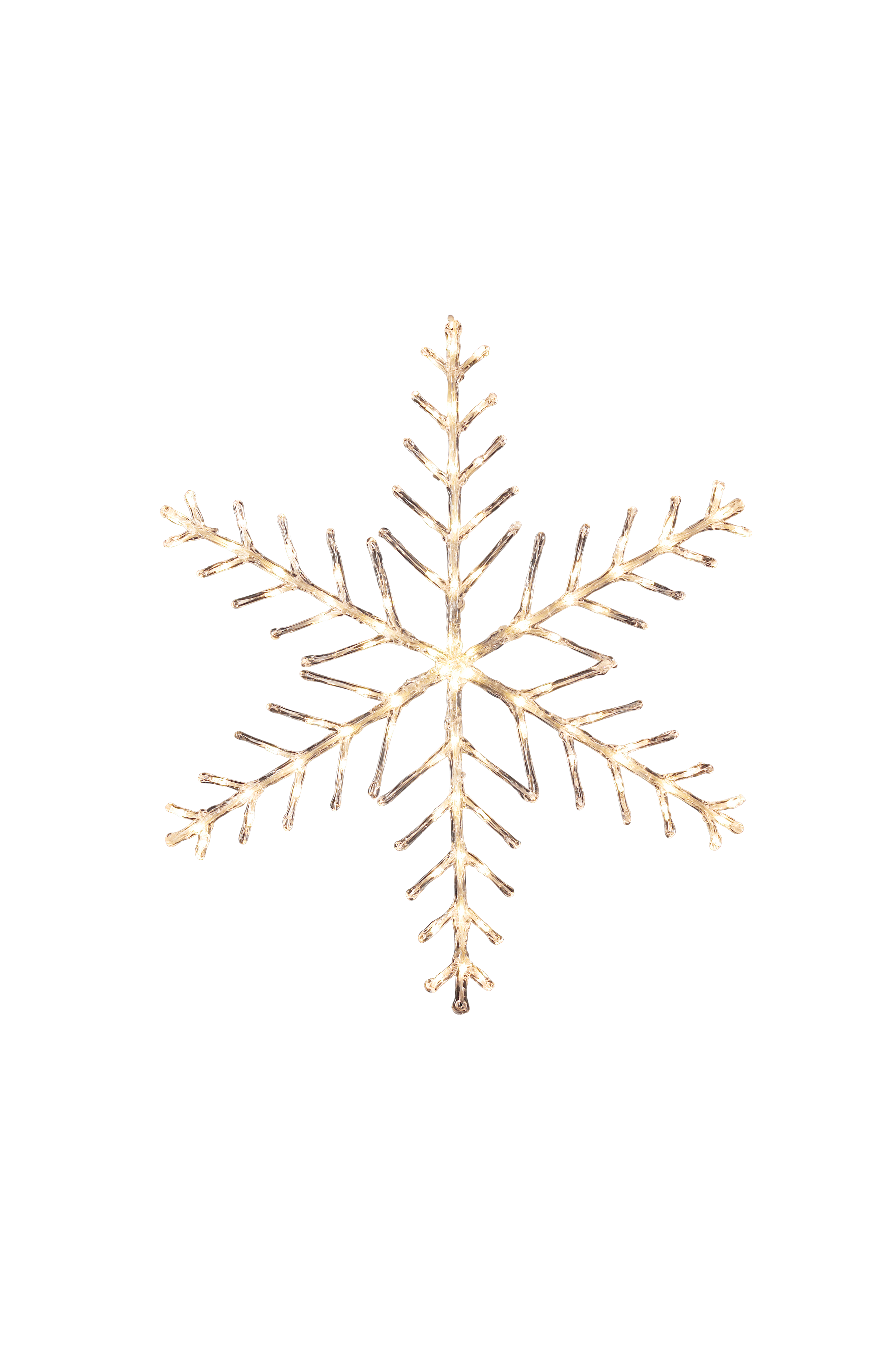 Lumihiutale, jossa 96 lämpimän valkoista LED-lamppua. Ulkokäyttöön. Toimii 24 voltin muuntajalla. Läpikuultava liitäntäjohto 5 metriä. Halkaisija 100 cm.