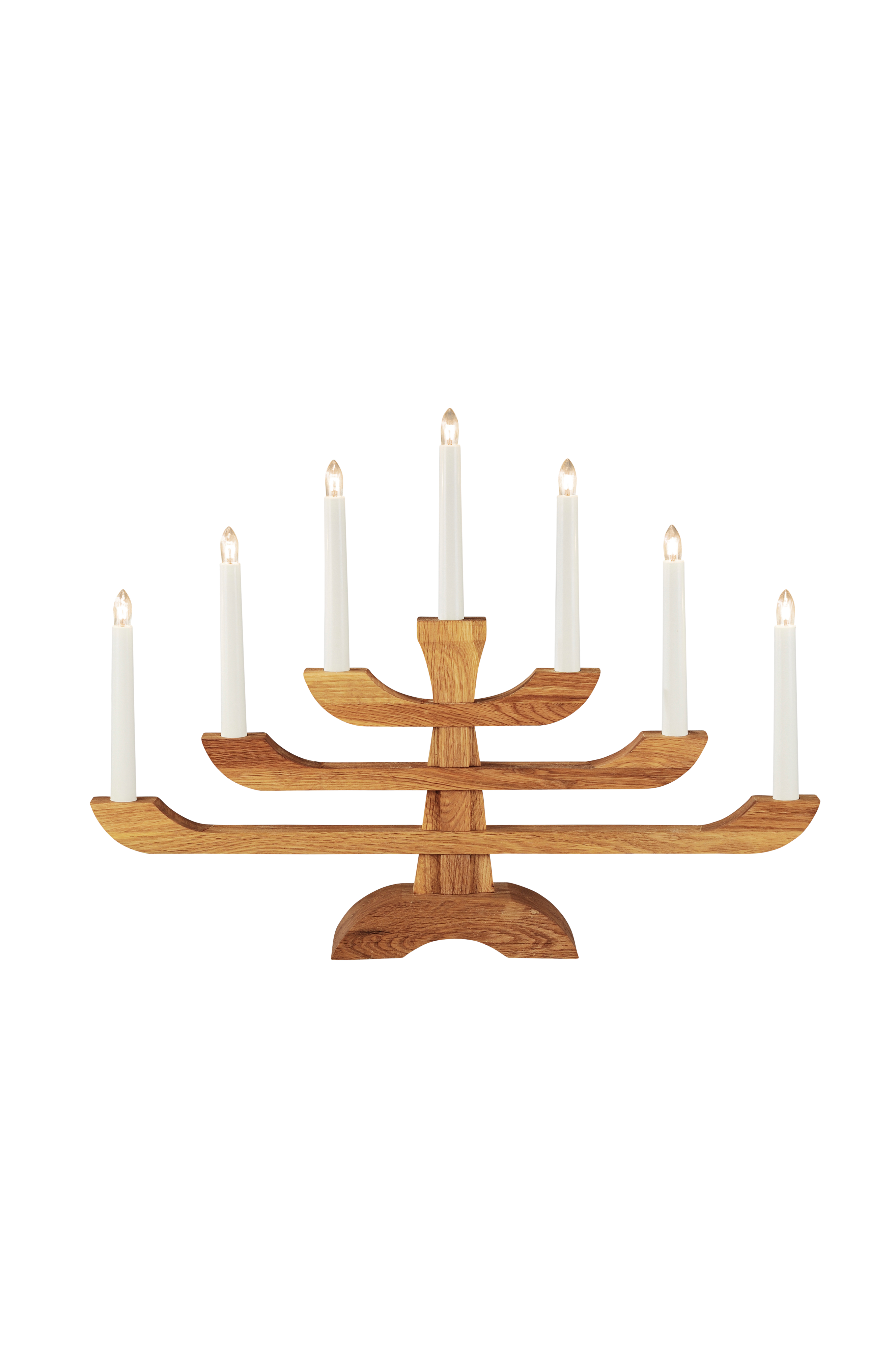 7-haarainen sähkökynttelikkö öljyttyä massiivitammea, 230 V. Lämpimän valkoiset lamput. 1,7 metrin pituinen liitäntäjohto. Virtakatkaisin johdossa manuaalista sytyttämistä ja sammuttamista varten. Korkeus 39 cm ja leveys 53 cm.