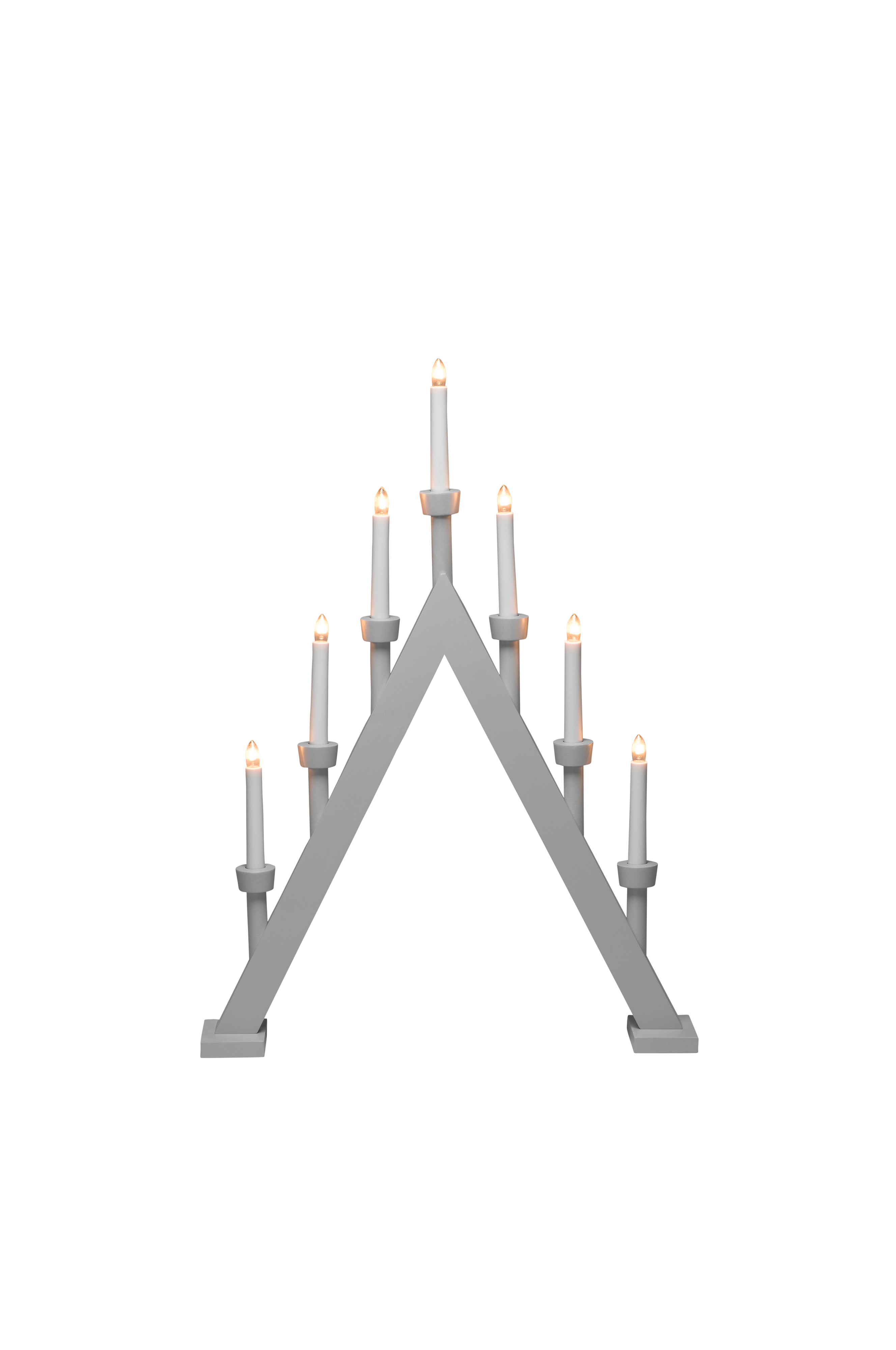 7-haarainen sähkökynttelikkö maalattua puuta, 230 V. Lämpimän valkoiset lamput. Liitäntäjohto 1,7 metriä. Virtakatkaisin johdossa manuaalista sytyttämistä ja sammuttamista varten. Korkeus 65 cm ja leveys 47 cm.