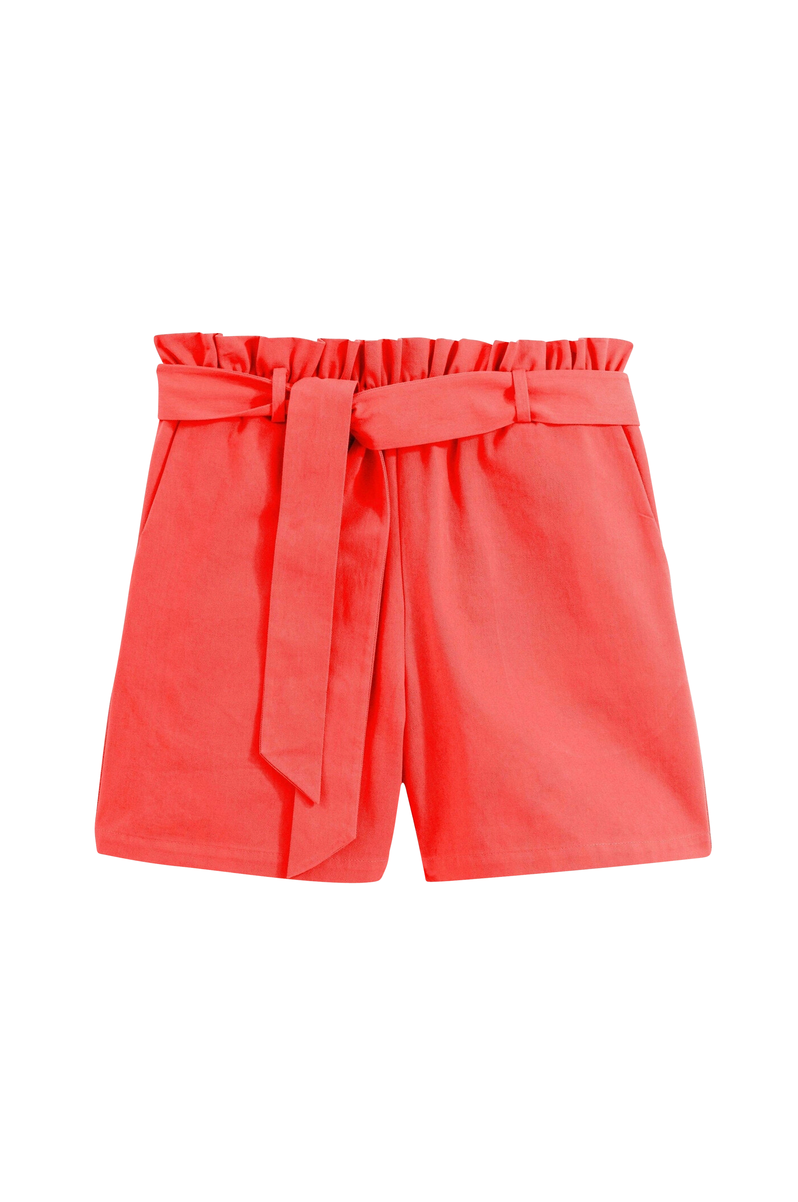 Shortsit, joissa persoonallinen malli. Vyötärönauhassa solmimisvyö ja laskokset, jotka korostavat vyötäröä.