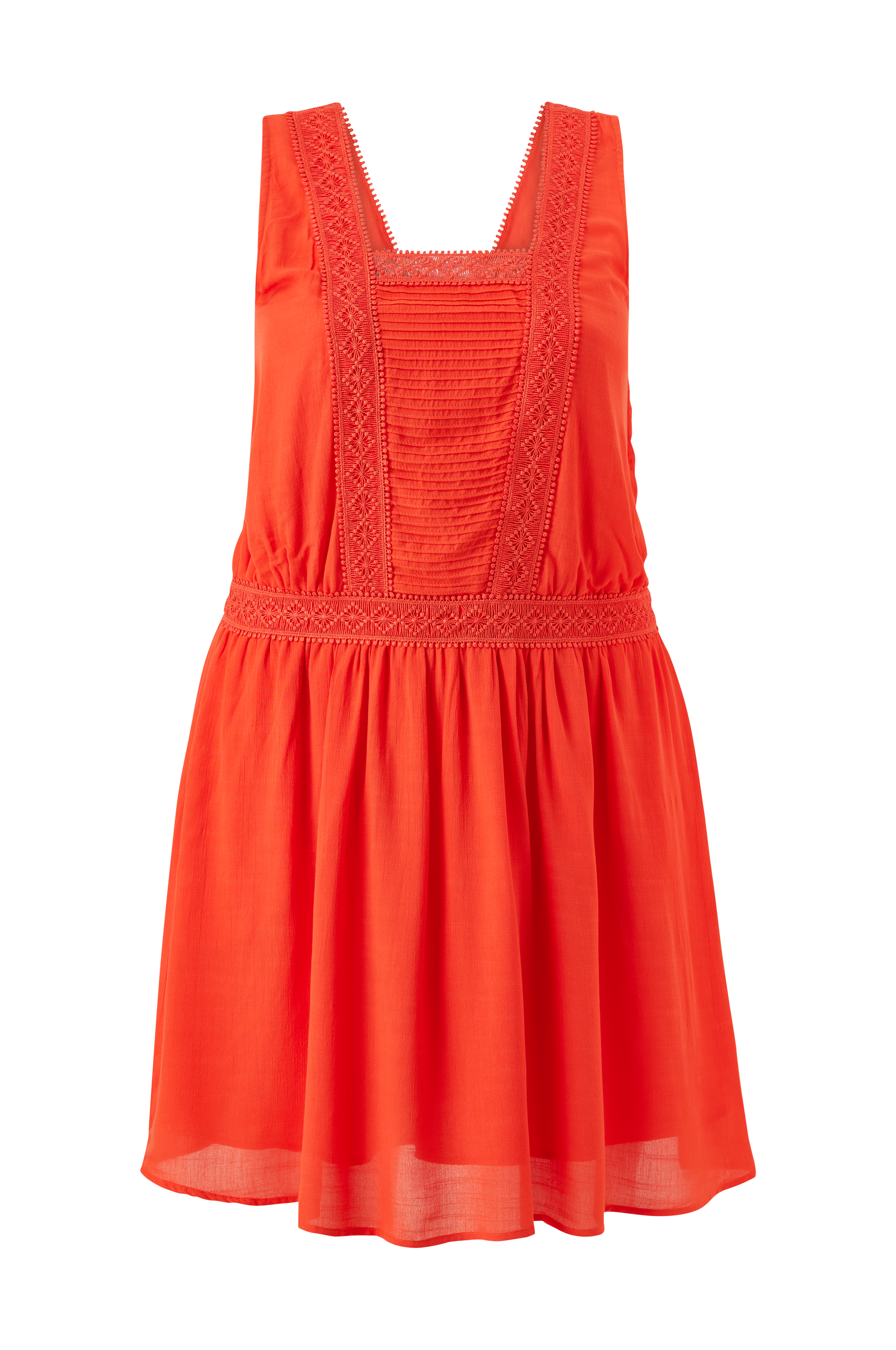 Värikäs mekko, jossa kesäinen tyyli. Kaunis, kulmikas pääntie edessä ja ristikkäinen pääntie takana. Yksityiskohdat - Suora malli - Lyhyt malli - Hihaton malli - V-pääntie Materiaali ja hoito-ohje - Ensisijainen materiaali: 100% viskoosia - Vuori: 100% polyesteriä - Ei konepesua - Silitys keskilämmöllä/ei valkaisuainetta - Ei rumpukuivausta - Hellävarainen kemiallinen pesu Lisätietoja - Kulmikas pääntie edessä - Pliseerattu upotus rinnassa - Ristikkäinen pääntie takana - Pitsinauha - Pituus 98 cm koossa 38