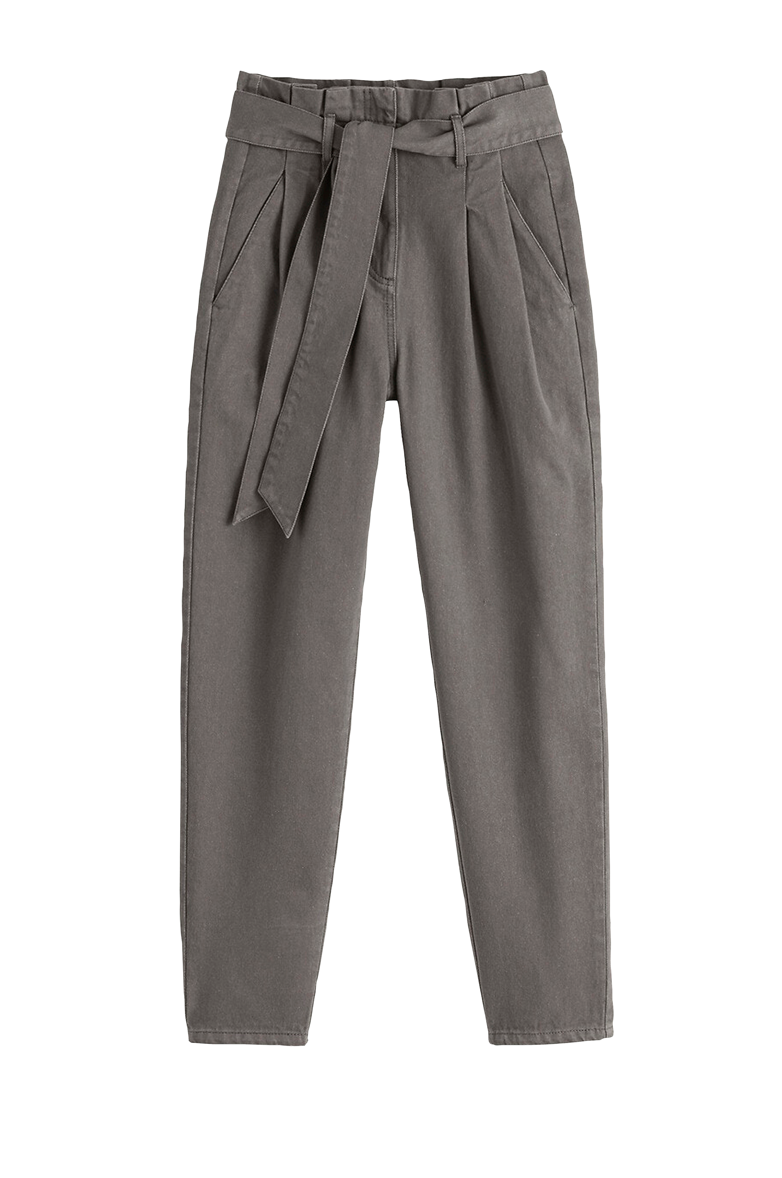 50-lukuhenkinen paperbag-malli. Naisellinen malli, jossa vyötäröä korostava solmimisvyö.